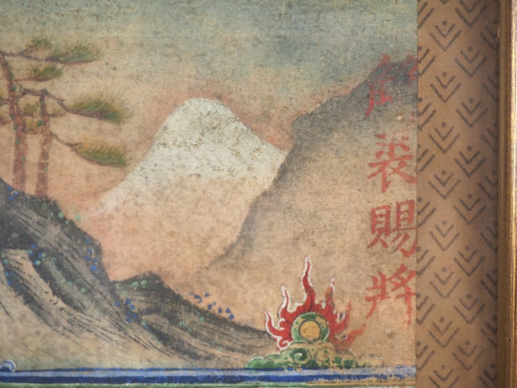 Chine, époque Qing Encre et couleurs sur soie relatant une histoire sous la dynastie Song entre l’Empereur Taizu (927 - 976) et le chef de l’armée Wang Quanbin sur l’importance d’avoir un chef d’état compréhensif pour réussir au combat. Signée en haut à droite Dim. 45 x 35 cm.