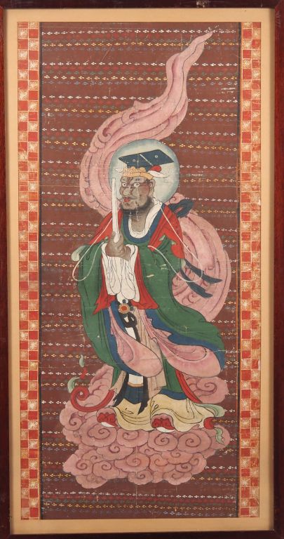 Chine, époque Qing, XIXe siècle, Deux encres et couleurs sur papier représentant des divinités du Tao. Usures. Dim. 86 x 42 cm