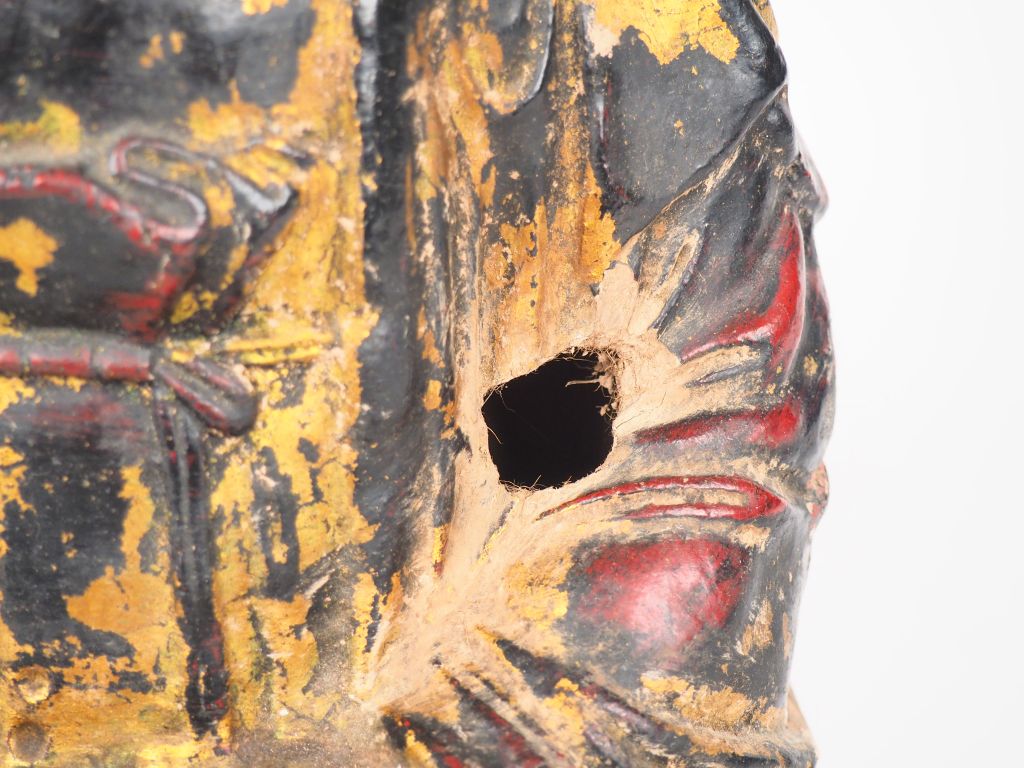 Chine, fin de l’époque Ming, Grand bouddha en stuc assis en méditation, les mains en dhyâna-mudra. Traces de polychromie dorée, rouge et bleu. H. 39 cm (accident)