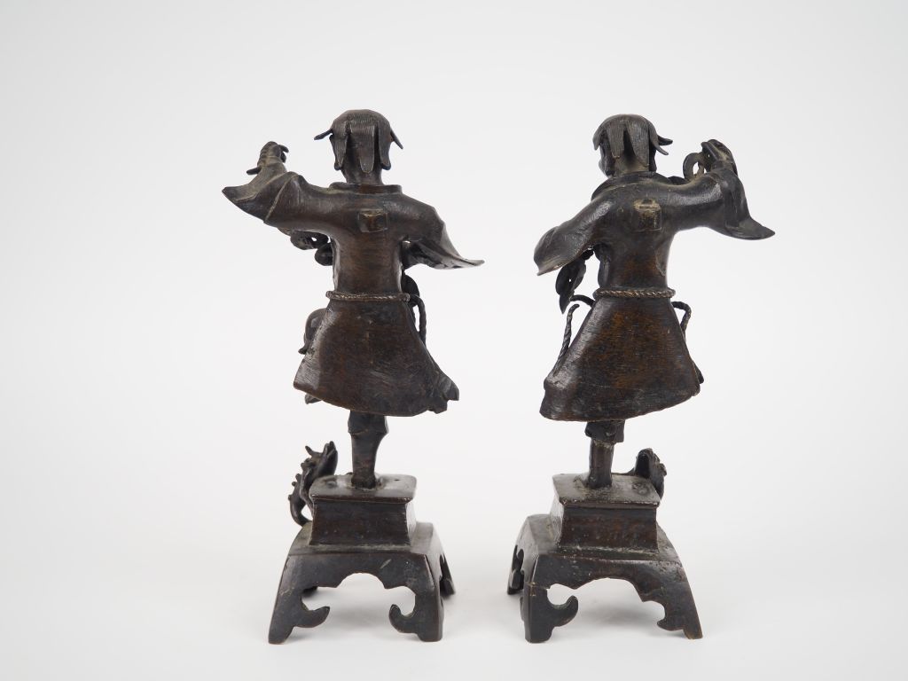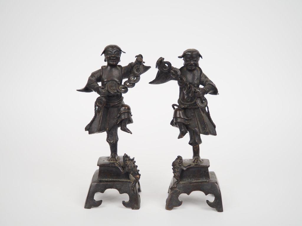 Chine, fin de l’époque Ming, XVIIe siècle, Paire de statuettes en bronze représentant un Liu Hai déroulant un cordon de sapèques accompagné de son crapaud céleste à trois pattes. H. 27 cm