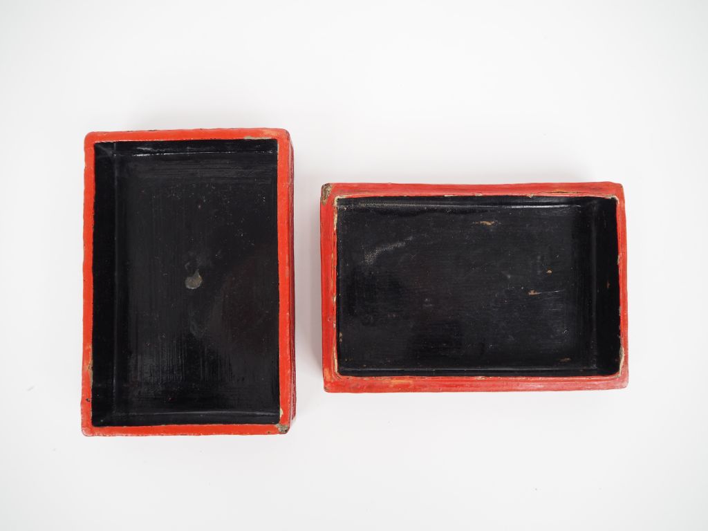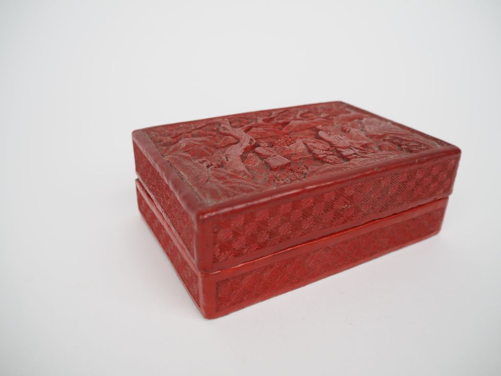 Chine, fin de l'époque Qing, Coffret à bijoux rectangulaire, en laque de cinabre sculptée de trois personnages parcourant un sentier montagneux, sous un pin de longévité. Accidents et manques. Dim. 5,3 x 14 x 9,5 cm