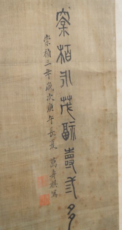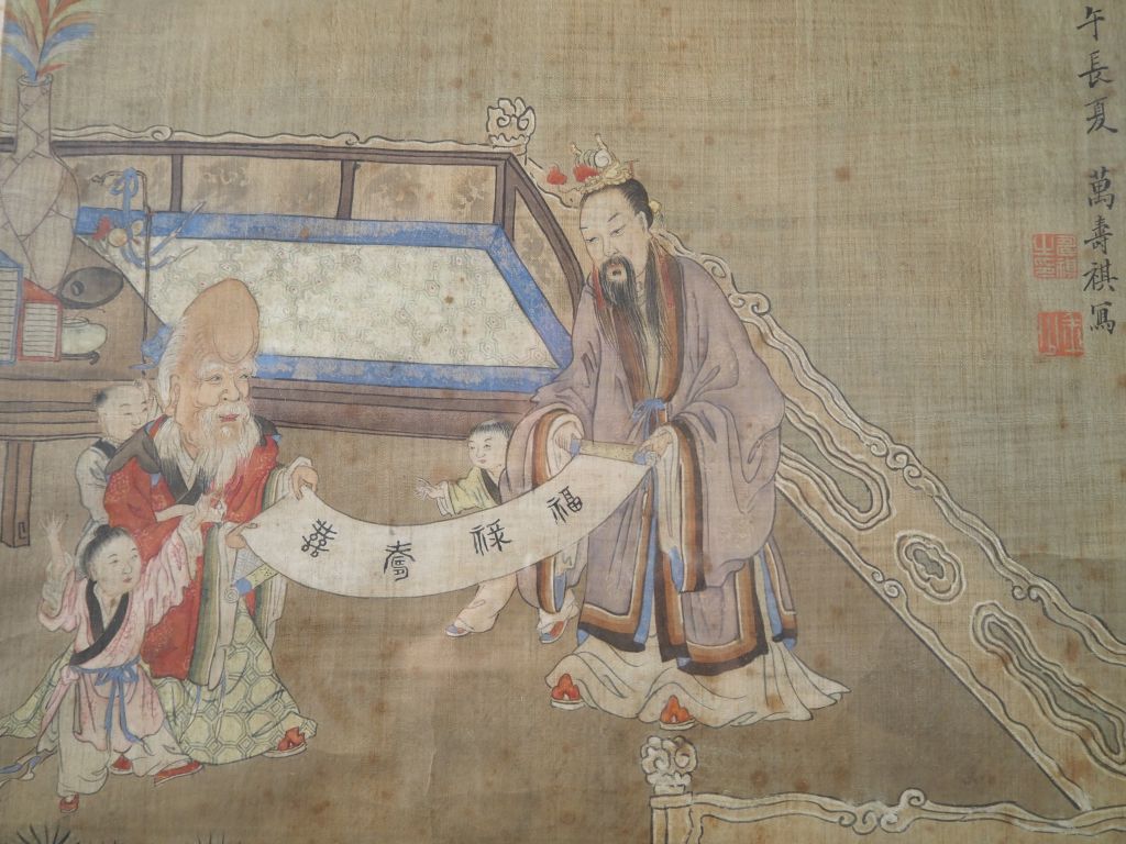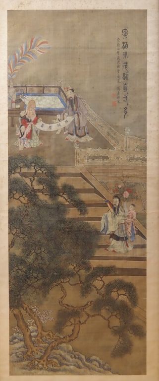 Chine, fin de l’époque Qing, Encre et couleurs sur soie représentant un sage accompagné d’enfants étudiant un rouleau. Porte des inscriptions en haut à droite d’après un artiste de la fin de la dynastie des Ming Wan Shouqi (1603-1652), porte une date apocryphe 1630. Dim. 138 x 58 cm