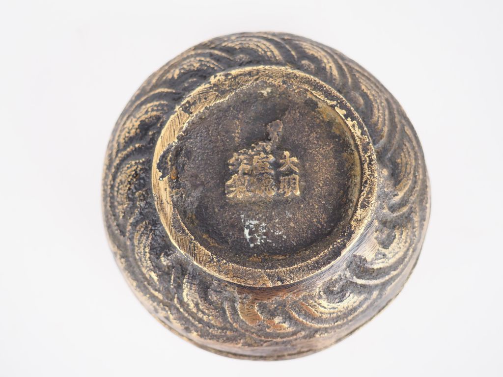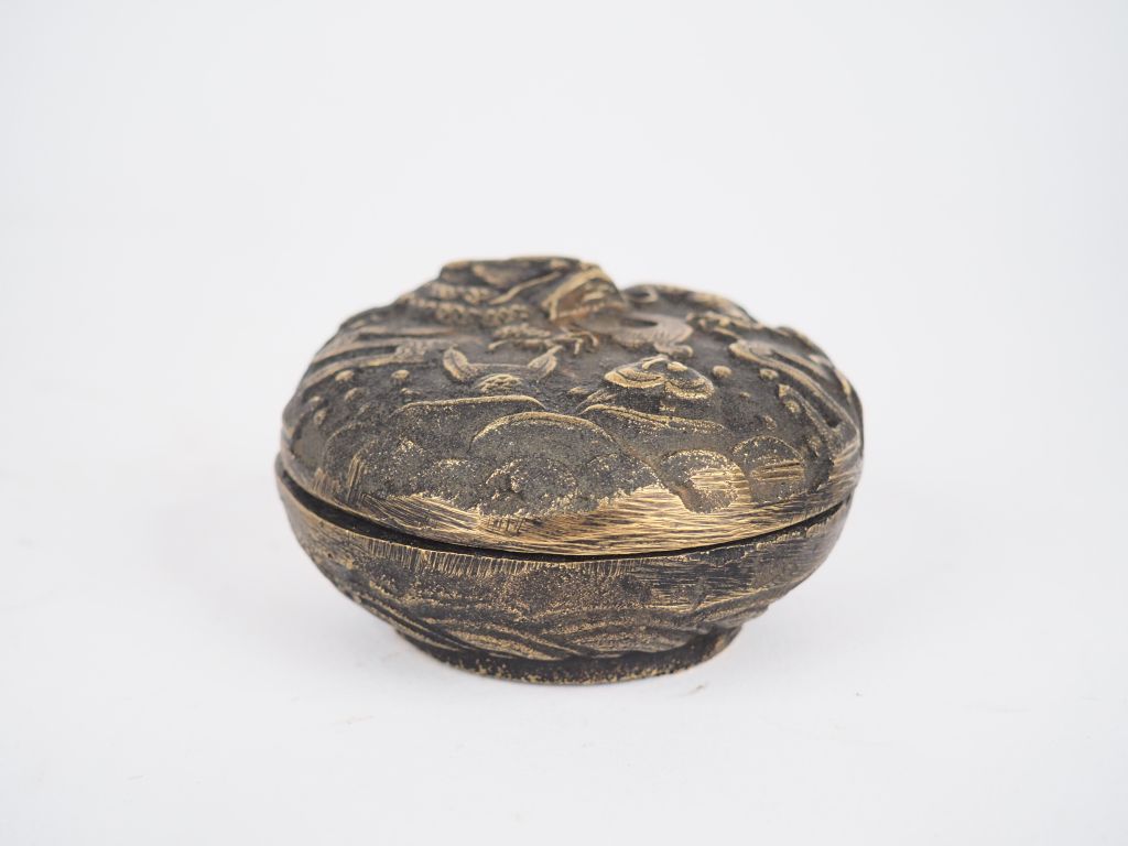 Chine, fin du XIXe siècle, Boite couverte en bronze, décor de dragons marque apocryphe Xuande. Diam. 7 cm
