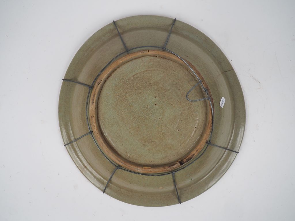 Chine, fin du XIXe siècle, Plat en céramique émaillée beige et bleu dans le style des Ming. (Style de swato) D. 39 cm fêle