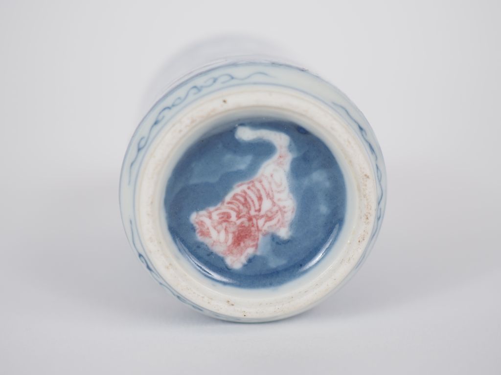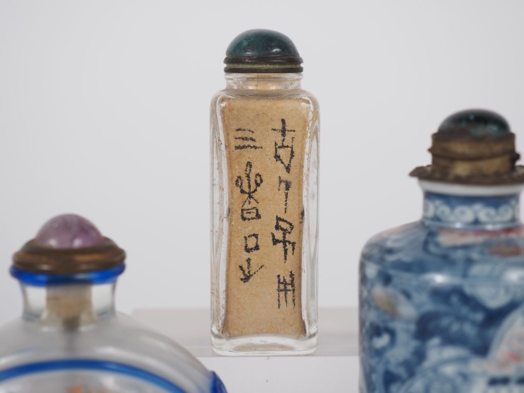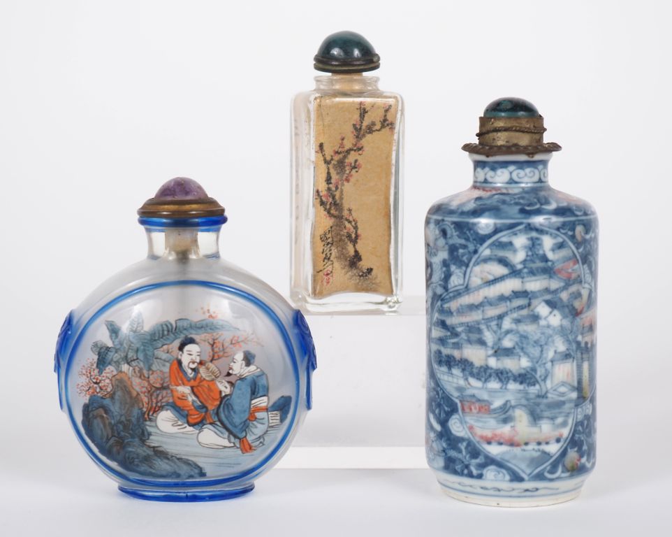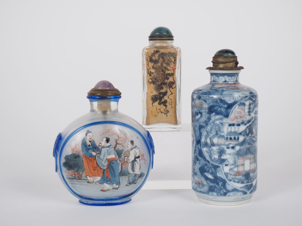 Chine, fin XIXe et XXe siècle Trois flacons tabatières, l’un en cylindrique en porcelaine et émail bleu et rouge de fer, vues d’architecture et jardin arboré , et deux flacons en verre peint à l’intérieur à décor de personnages, oiseaux et végétaux H. 6 à 9 cm (égrenures)