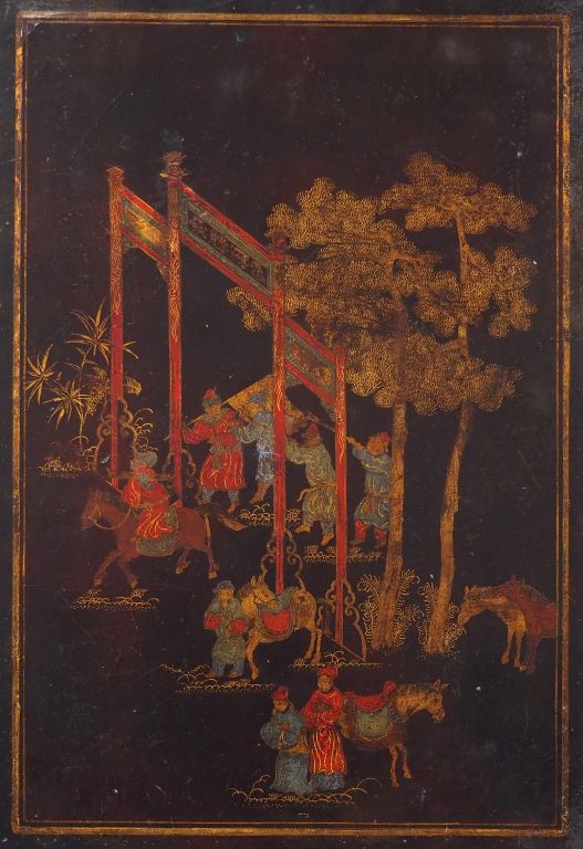 Chine fin XIXe siècle, Important panneau en laque à décor polychrome et rehauts d’or, de l’arrivée d’un dignitaire et de sa suite. Dim. 102 x 70 cm