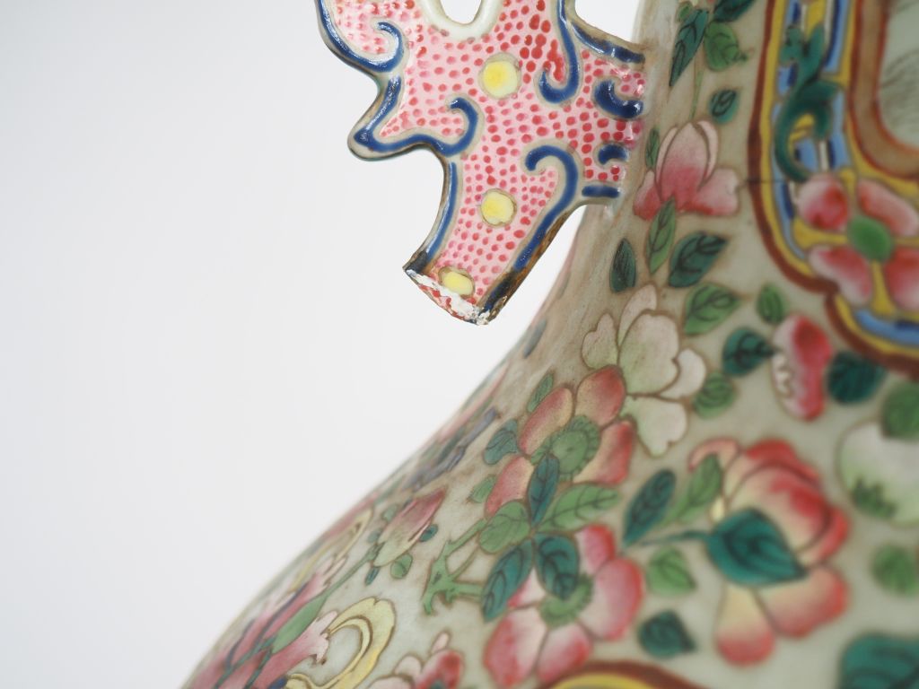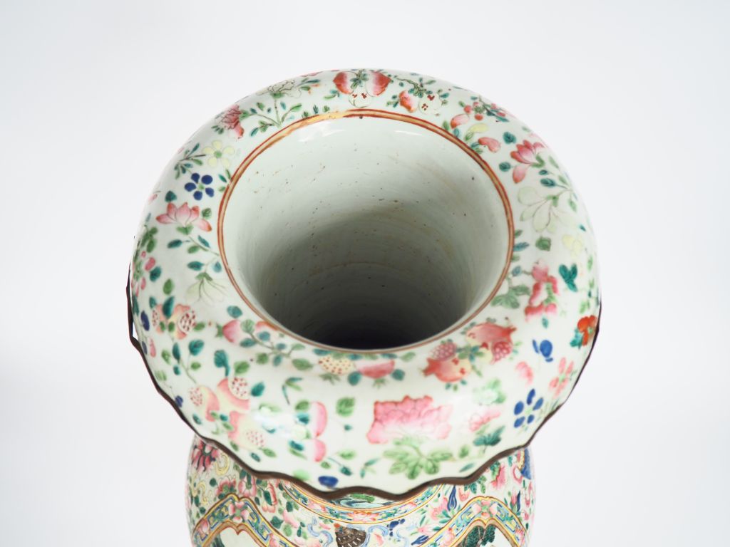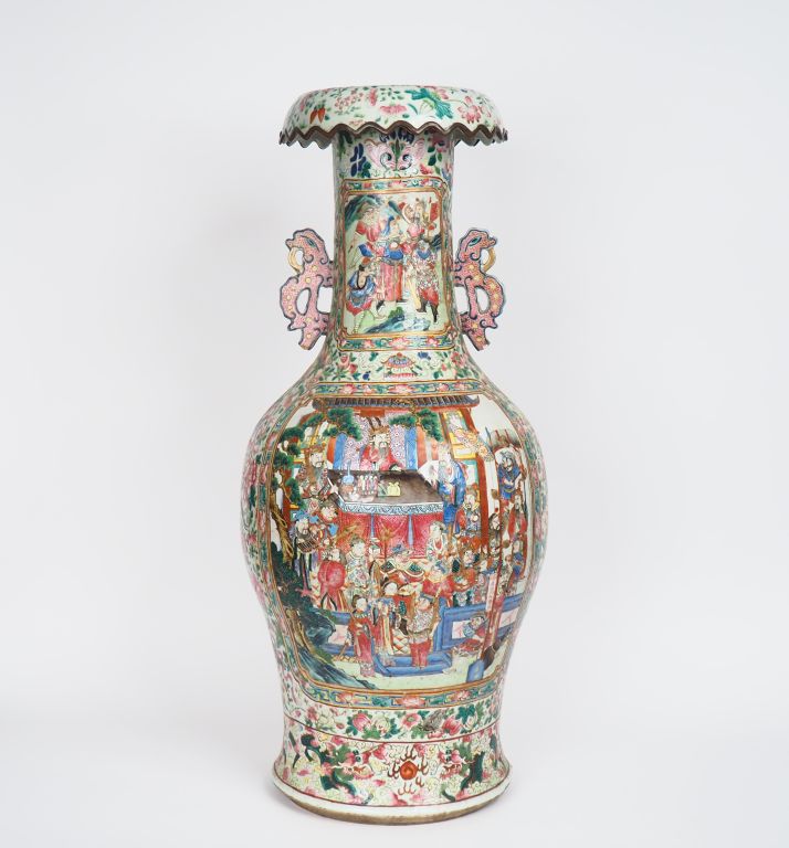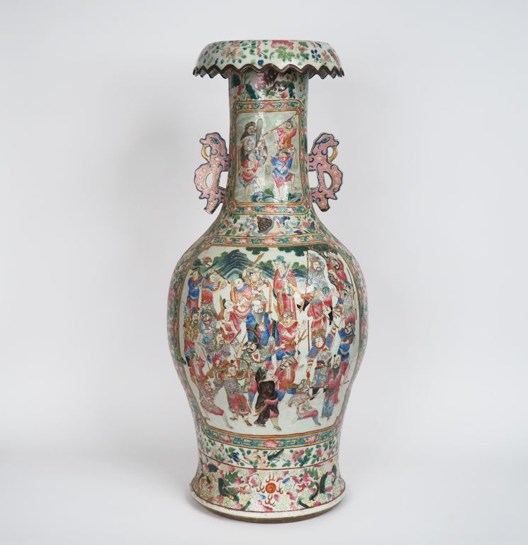 Chine, fin XIXe siècle, Important vase de palais en porcelaine et émaux de la famille rose, à décor d'une assemblée de lettrés, personnages burlesques. Le col ourlé, les anses en forme de dragons stylisés. H. 90 cm