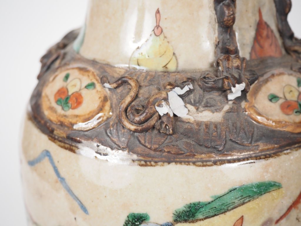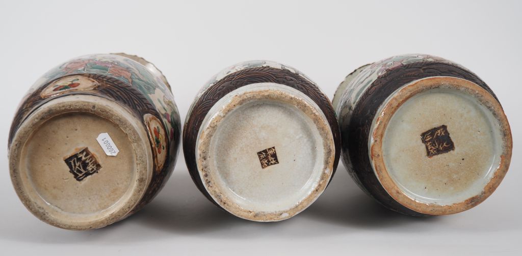 Chine, fin XIXe siècle Lot de trois vases en porcelaine de Nankin, comprenant une paire en émaux de style famille roses, à décor de joutes équestres et scènes de bataille , et un vase en porcelaine de Nankin, à décor de personnages. H. 35,5 et 34,5 cm (Eclat au dernier – Petites égrenures)