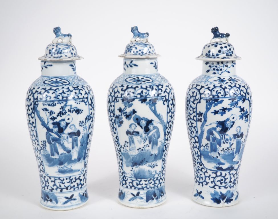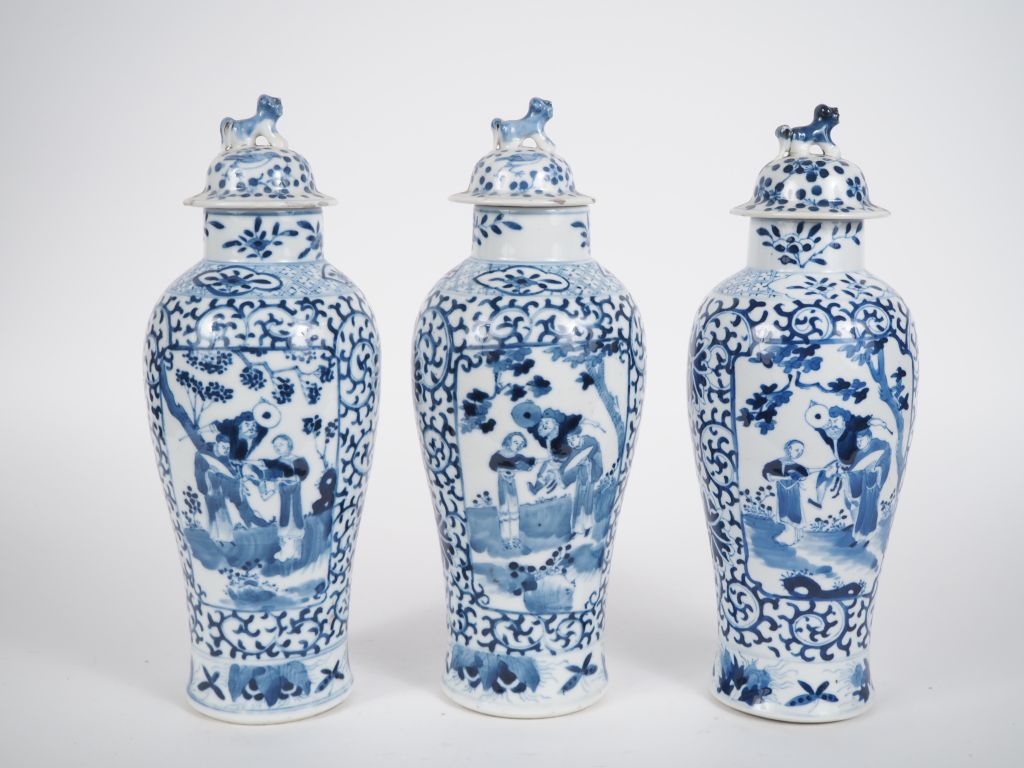 Chine fin XIXe siècle, Trois vases balustres couverts, en porcelaine blanche, à décor en bleu sous couverte de scènes de personnages. (égrenures sur les couvercles) H. 33 cm