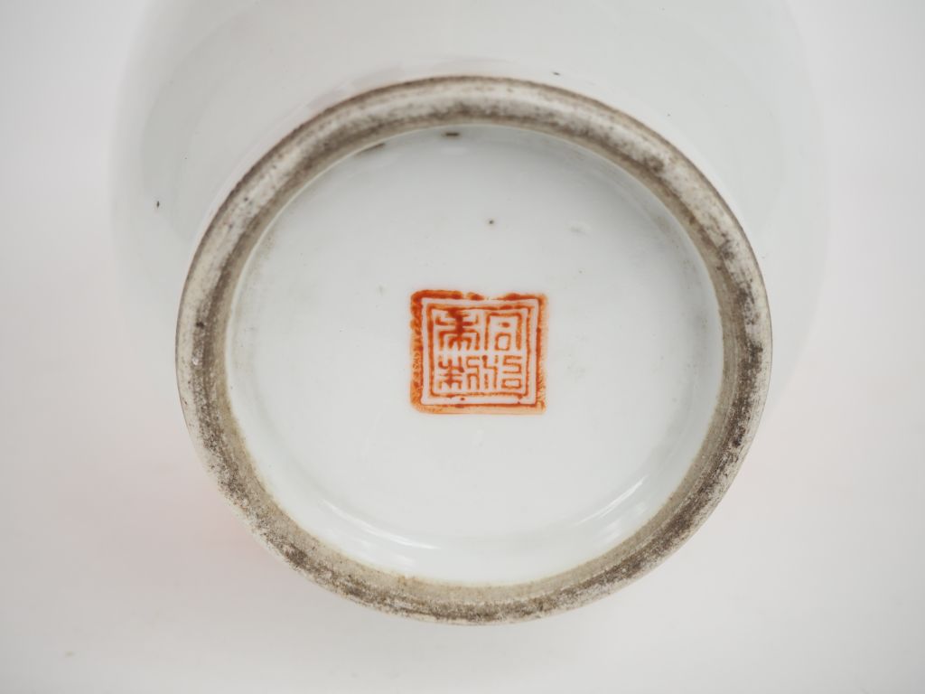 Chine, fin XIXe siècle Vase balustre en porcelaine blanche à décor émaillé corail d’un lion bouddhique et son petit. Un poème calligraphié complète l’ornementation. Marque Tongzhi au revers. H. 24 cm