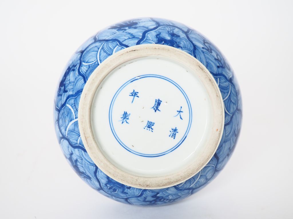 Chine, fin XIXe siècle, Vase bouteille en porcelaine bleu blanc à décor de lions stylisés. Marque apocryphe kangxi sur la base. H. 27 cm Voir catalogue Christies London, Fine chinese and works of art mardi 6 juin 2000
