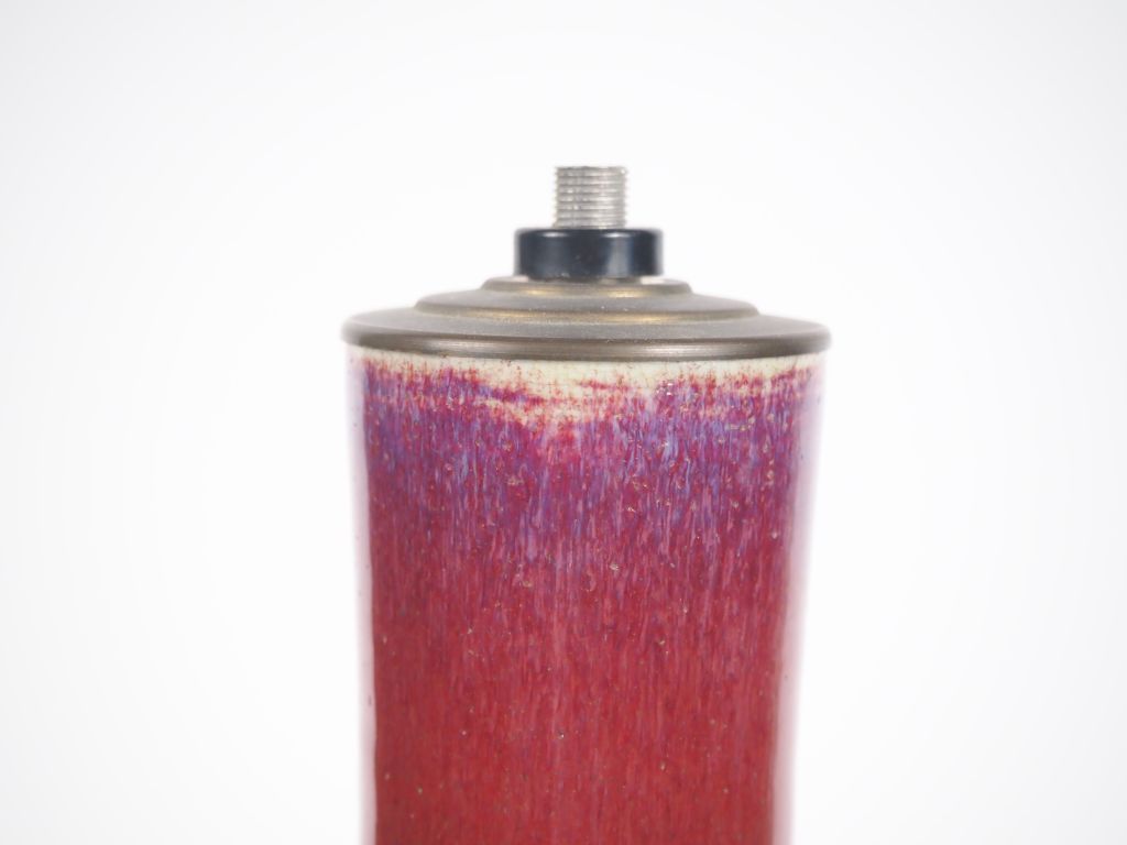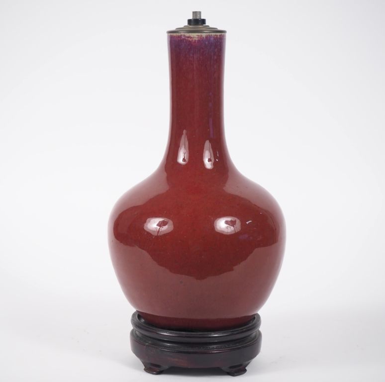 Chine, fin XIXe siècle, Vase pansu à long col en porcelaine émaillée sang de boeuf, le col légèrement flammée bleu lavande. Monté en lampe. H. 30,5 cm (égrenures à la base)