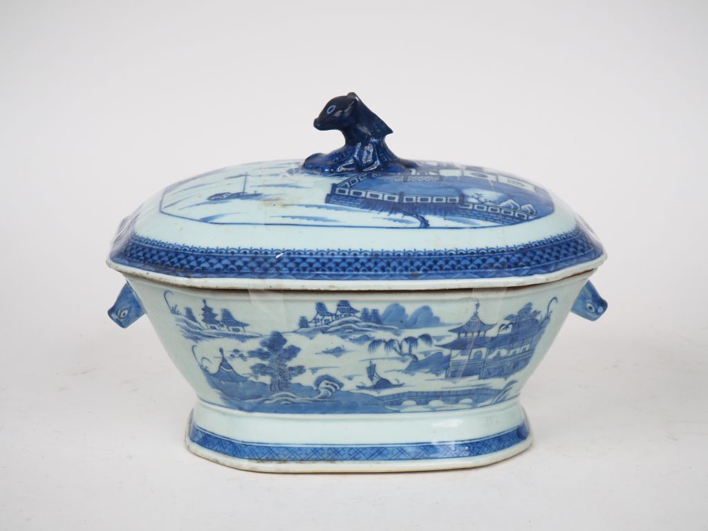 Chine fin XIXème. Terrine couverte bleu blanc à décor de paysage lacustre. L. 31 cm prise du couvercle restaurée