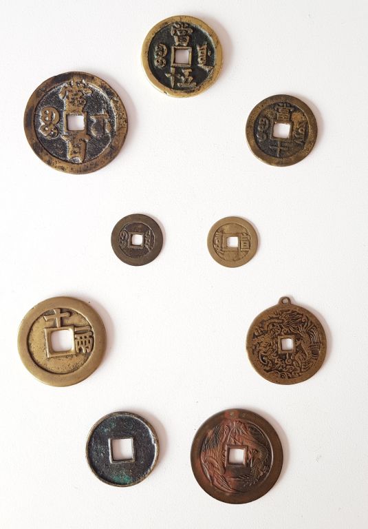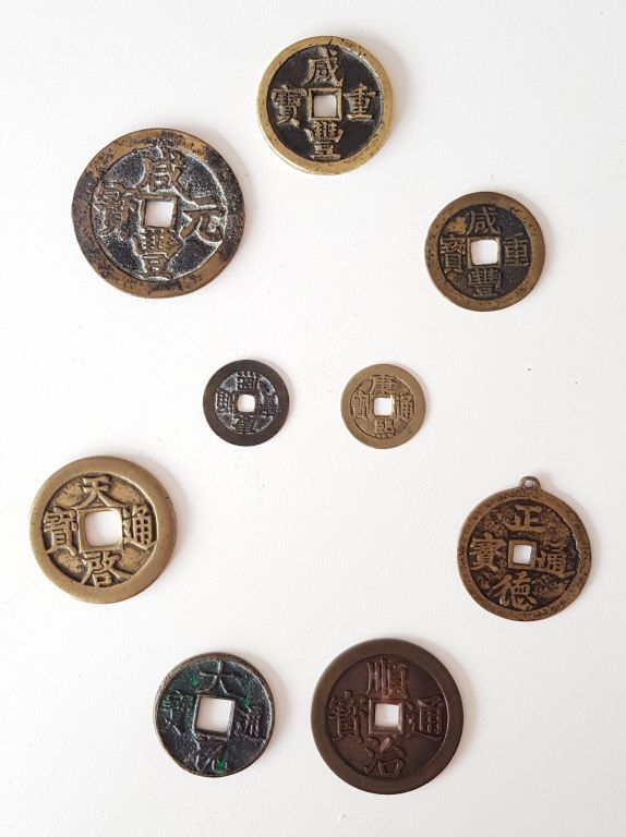 Chine Lot de neuf sapèques en alliages de cuivre, comprenant : . Trois au nom de Xianfeng , . Deux au nom de Kangxi , . Quatre marquées respectivement Tianqi , Daguan , Shunzhi et Zhengde Diam. 2,7 cm à 5,3 cm