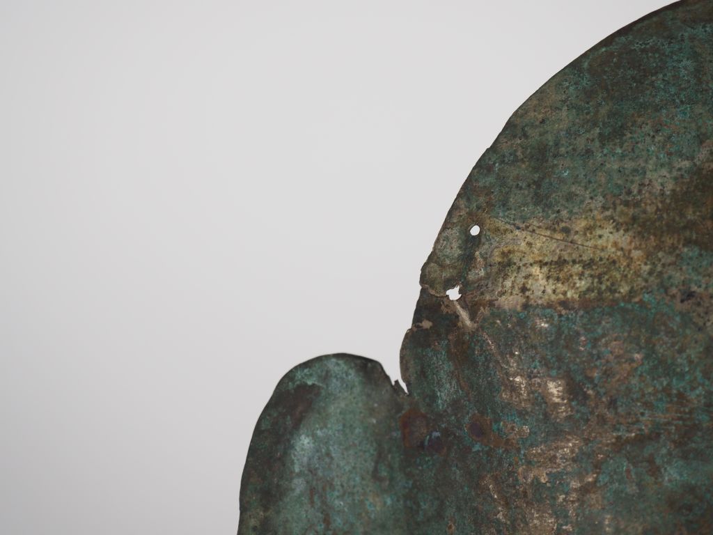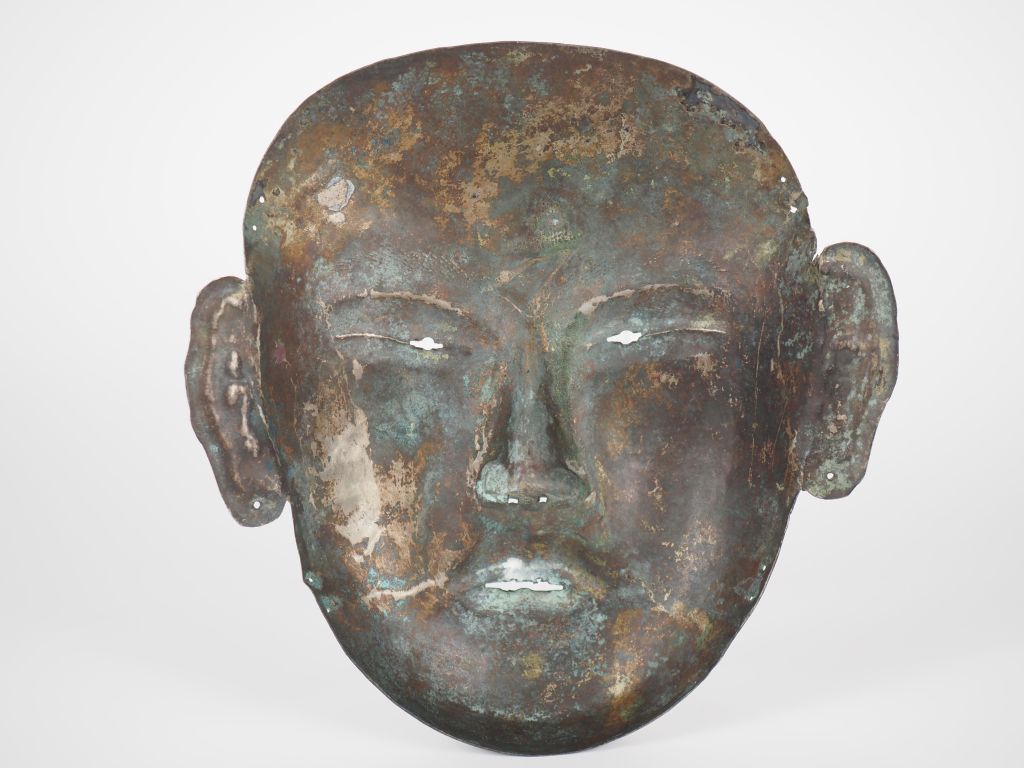 Chine. Masque en cuivre argenté, dans le style des masques funéraires de l’époque Liao. H. 22 cm