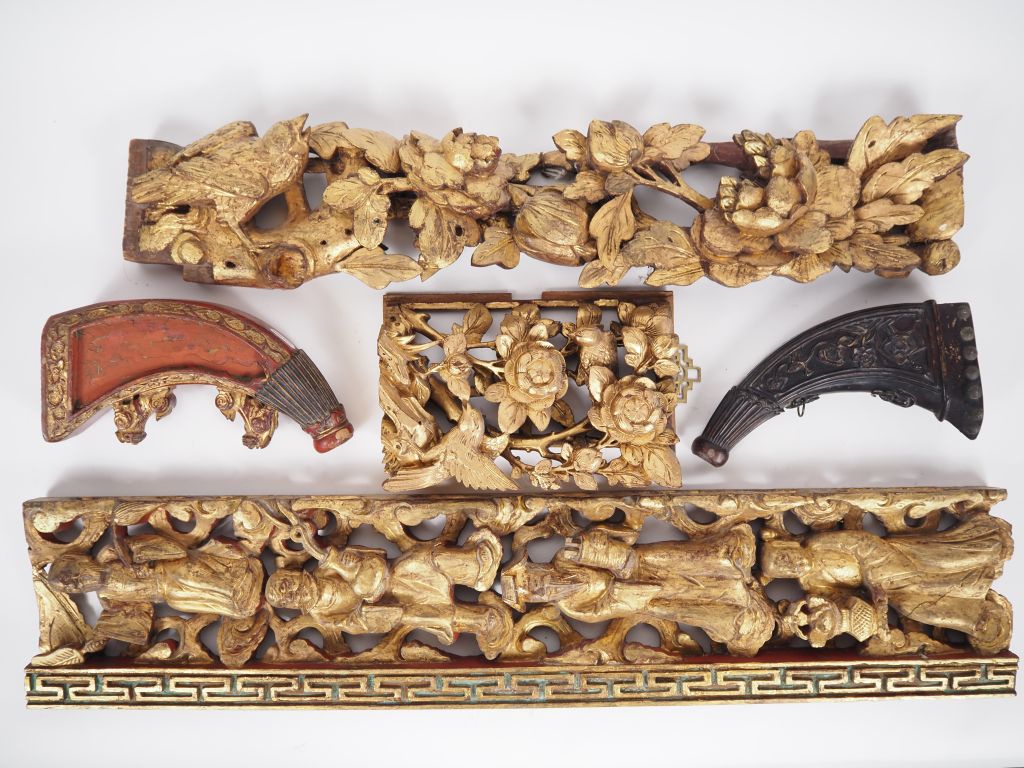 Chine, Ningbo, fin XIXe siècle Ensemble d’éléments décoratifs en bois anciennement laqué et doré, représentant divers personnages, oiseaux, fleurs et végétaux, et deux en forme de corne d’abondance formant boîtes à poudre. H. 24 à 82 cm
