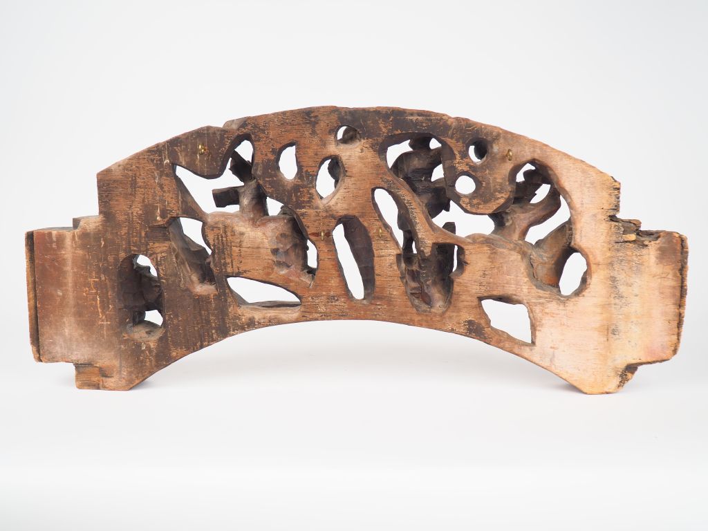 Chine, Ningbo XIXe siècle, Support bois sculpté laqué et doré représentant des cavaliers sous des pins. Dim. 73 x 32 cm