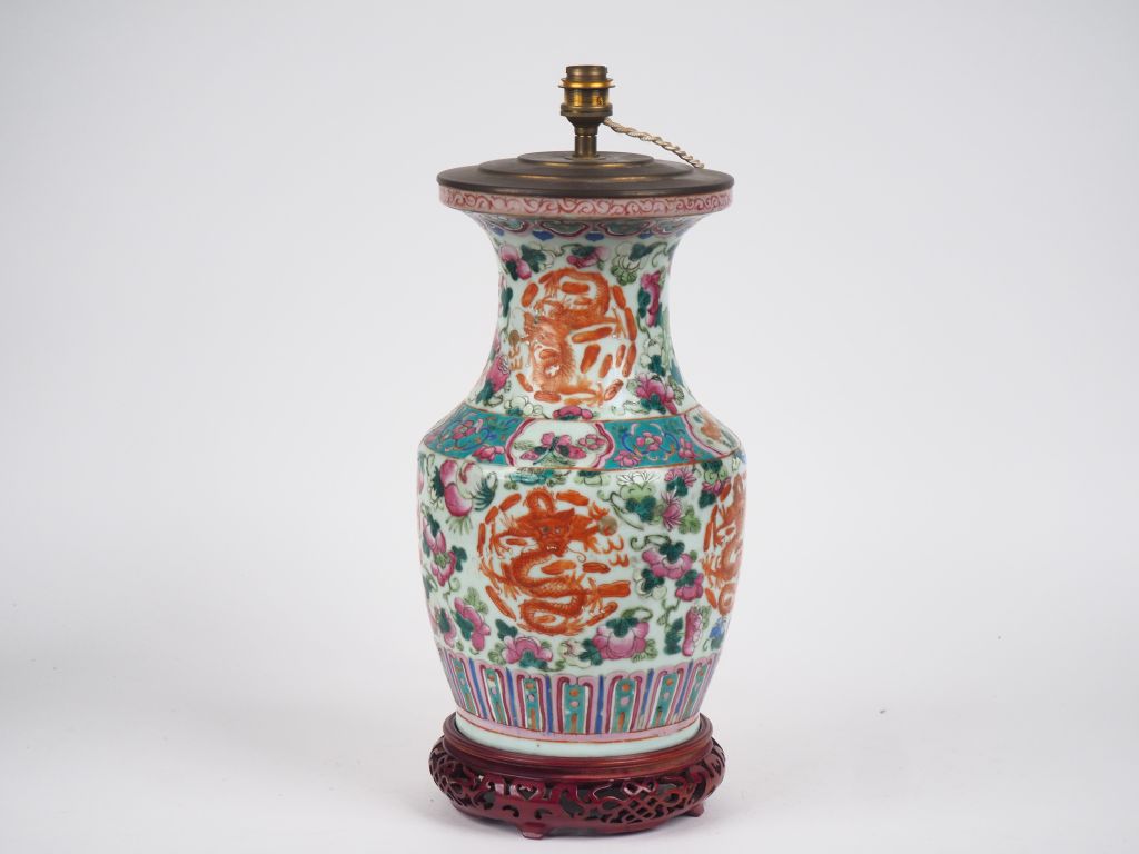 Chine, période Guangxu Vase balustre en porcelaine et émaux de la famille rose à décor de dragons lovés émaillés corail en réserve sur fond de fleurs et végétaux. Monté en lampe et fond étoilé H. 33,5 cm
