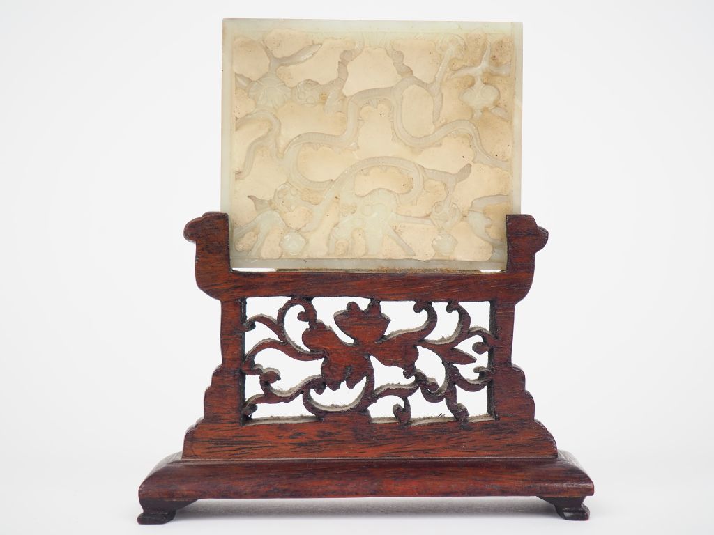 Chine période Jiaqing. 1796-1820 Petit écran de table en jade céladon finement sculpté d'un dragon déployé parmi des branches feuillagées. Dim. 6,8 x 8,2 cm