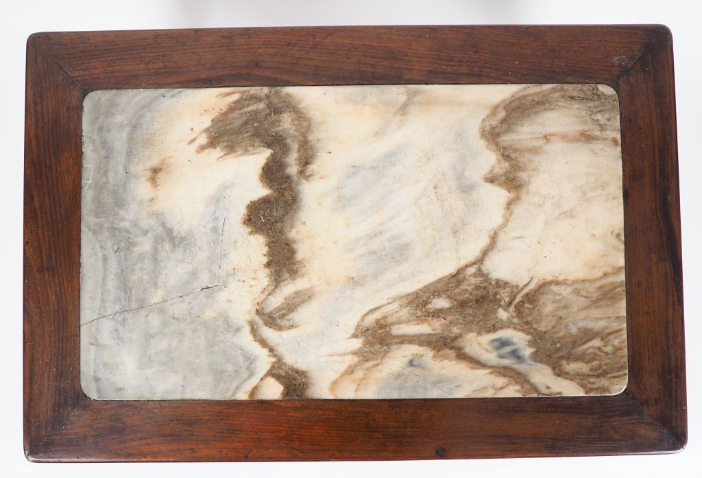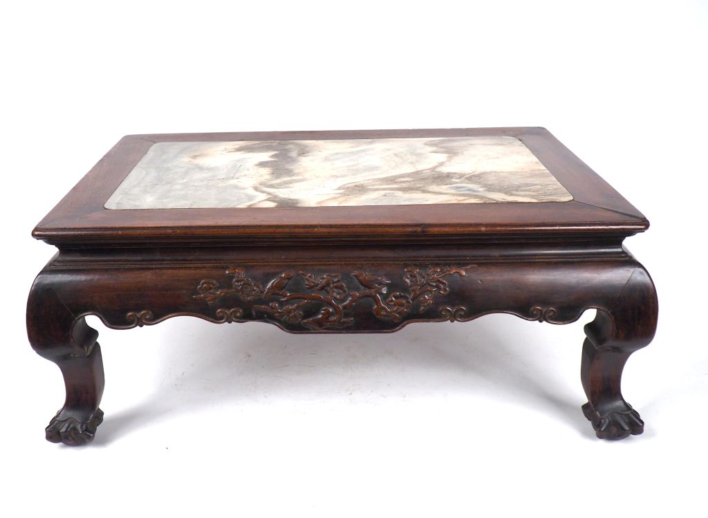 Chine, période jiaqing (XVIIIe-XIXe siècle) Petite table Kang en bois dur incrustée d’une plaque en pierre de rêve, le pourtour sculpté en léger relief de canards et lotus. Dim. 26 x 63 x 41,5 cm