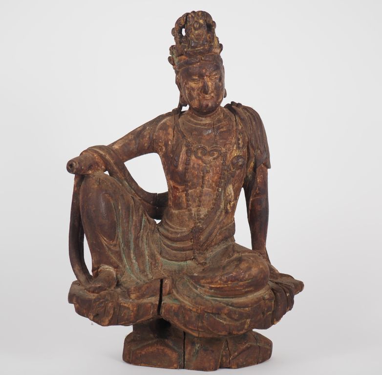 Chine, période Qing Statuette en bois, représentant une Guanyin assise en lalitasana (délassement royal) sur un rocher, la tiare comprenant la réminiscence d’Amitabha H. 41,5 cm
