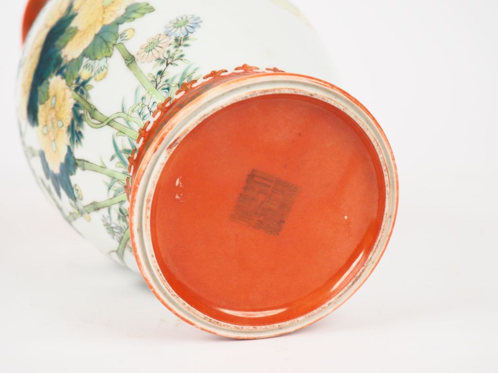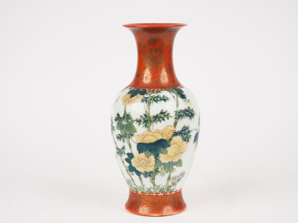 Chine, Période République, Petit vase balustre en porcelaine émaillée vert et jaune à décor de criquet parmi bambou et pivoiniers. Le col et la base émaillés corail, à décor réhaussé d'or de fleurs de lotus. Marque apocryphe Qianlong sur la base. H. 26 cm