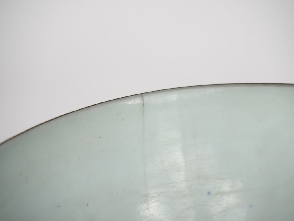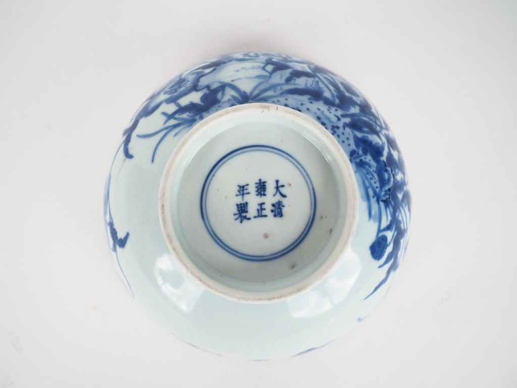 Chine pour le Vietnam, XIXe siècle, Coupe en porcelaine blanche à décor en bleu sous couverte d'arbustes en fleurs. Marque apocryphe Yong zheng sur la base. D. 17.8 cm fêle
