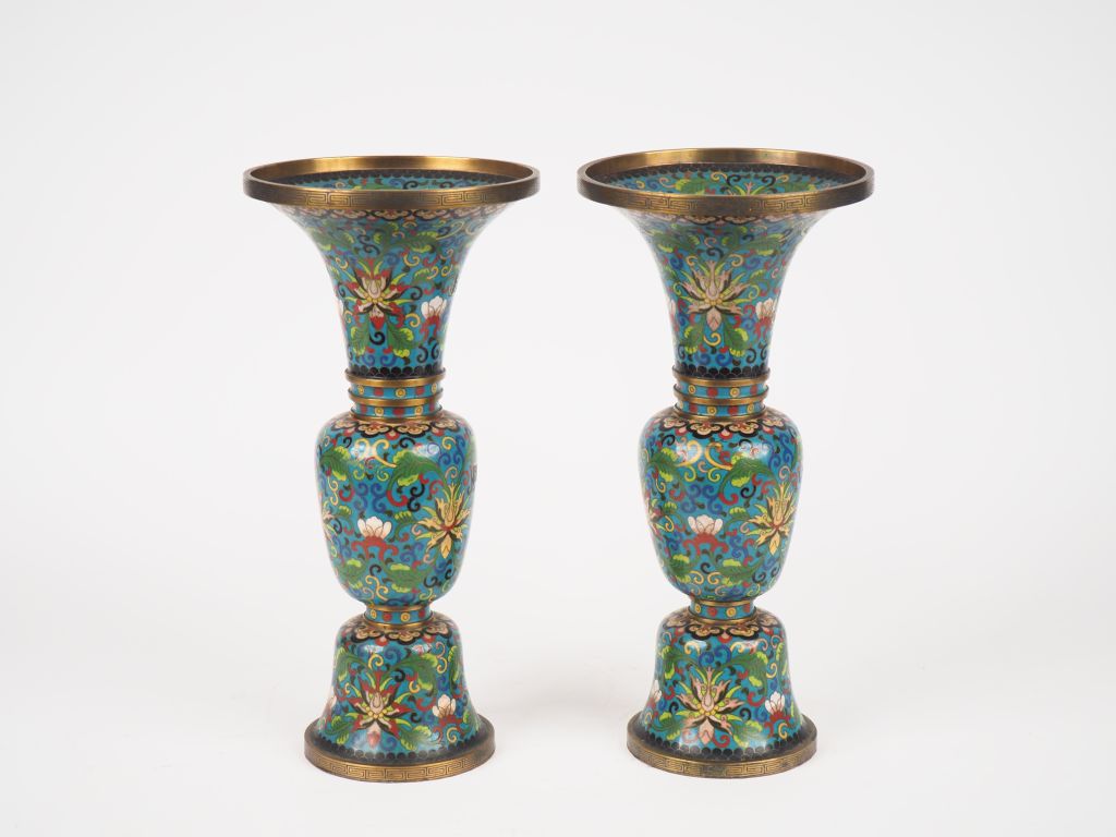 Chine, première moitié du XXe siècle, Paire de vases de forme gu en cuivre et émaux cloisonnés à décor polychrome de fleurs de lotus et rinceaux feuillagés. H.32 cm