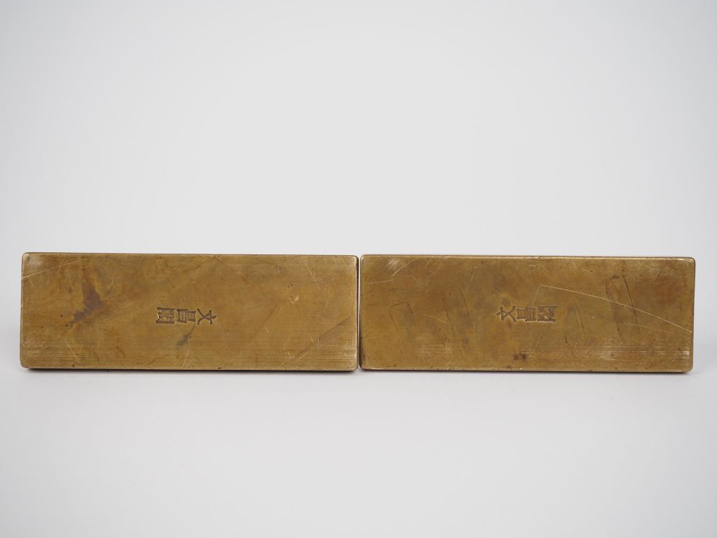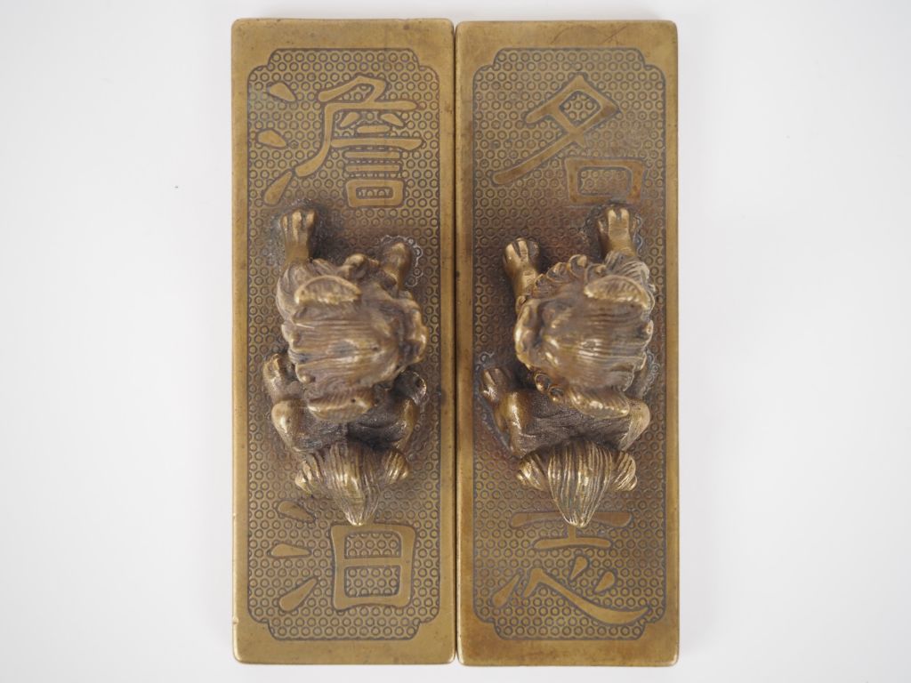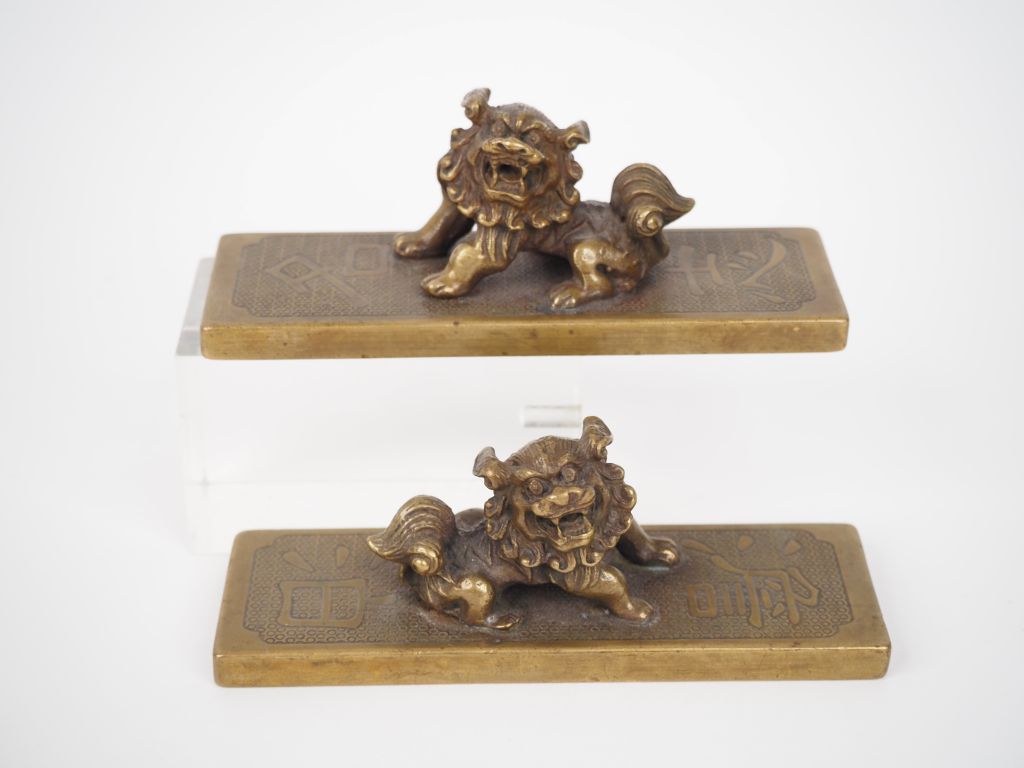 Chine, seconde moitié du Xxe siècle, Deux poids de calligraphe, en bronze de patine dorée, la prise surmontée de deux lions en haut relief évoquant l'indifférence et la lucidité. Le revers orné de calligraphies "prier pour réussir" Dim. 11 x 3,8 cm