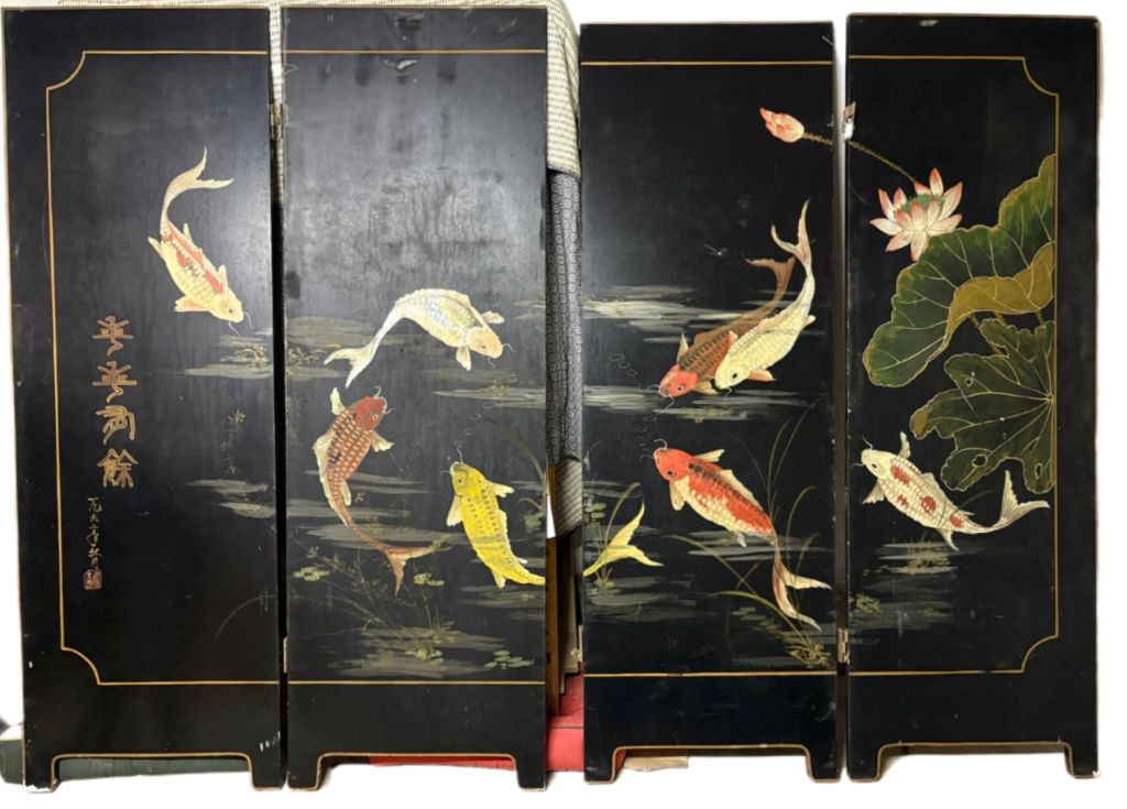 Chine, seconde moitié du XXe siècle, Grand paravent à quatre feuilles, en bois laqué, à décor polychrome double face, de carpes émergeant des flots, parmi des fleurs de lotus. Le revers à motifs d’oiseaux et papillons évoluant parmi des branches de prunus en fleurs. Des calligraphies en bas à gauche et à droite indiquant la date « 1992 » Usures. Dim. feuille. 180 x 60 cm