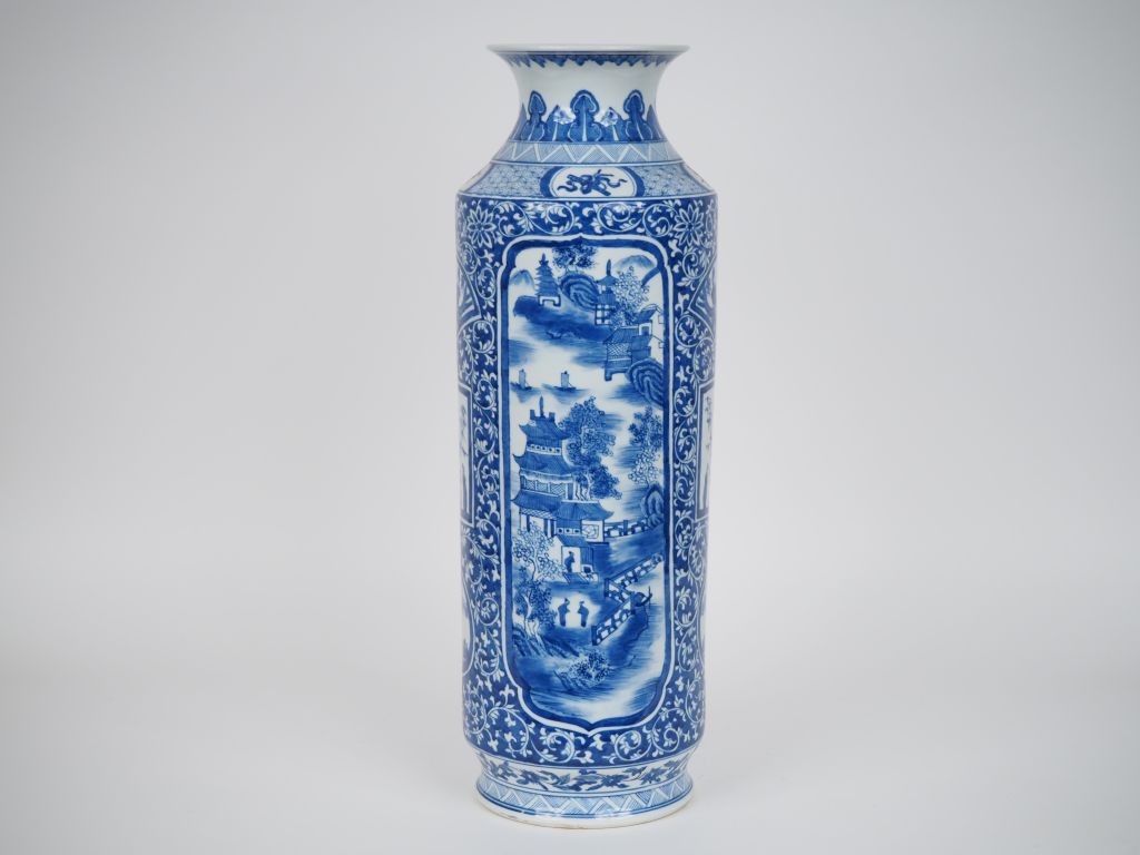 Chine, seconde moitié du Xxe siècle, Important vase cylindrique, en porcelaine bleu blanc, à décor en médaillons de vues d'architectures, scènes paysagées et personnages. Fleurs de lotus et rinceaux feuillagés complètent l'ornementation. Marque apocryphe Kangxi sous la base. H. 57 cm