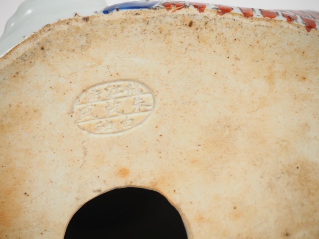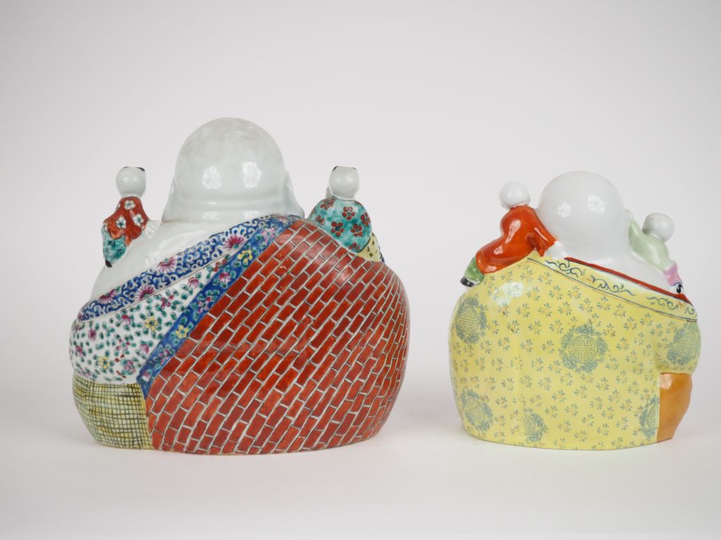 Chine, seconde moitié du Xxe siècle, Un bouddha milefo en porcelaine et émaux de la famille rose sur lequel évoluent cinq enfants. On y joint un bouddha milefo en porcelaine accompagné de cinq enfants. H. 27 cm H. 21 cm