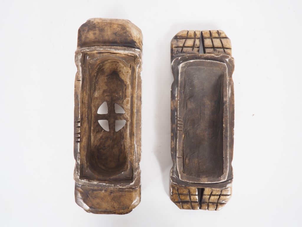 Chine, travail moderne. Brûle parfum en stéatite brun beige, les extrémités en forme de lions bouddhiques. Longueur : 25 cm