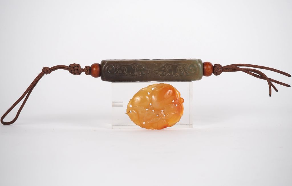 Chine, travail moderne Lot comprenant deux pendentifs, l’un en jade dans le style des Han, à décor d’animaux fantastiques, et l’autre en cornaline à motif de pêches de longévité. H. 8,5 cm et 4,8 cm
