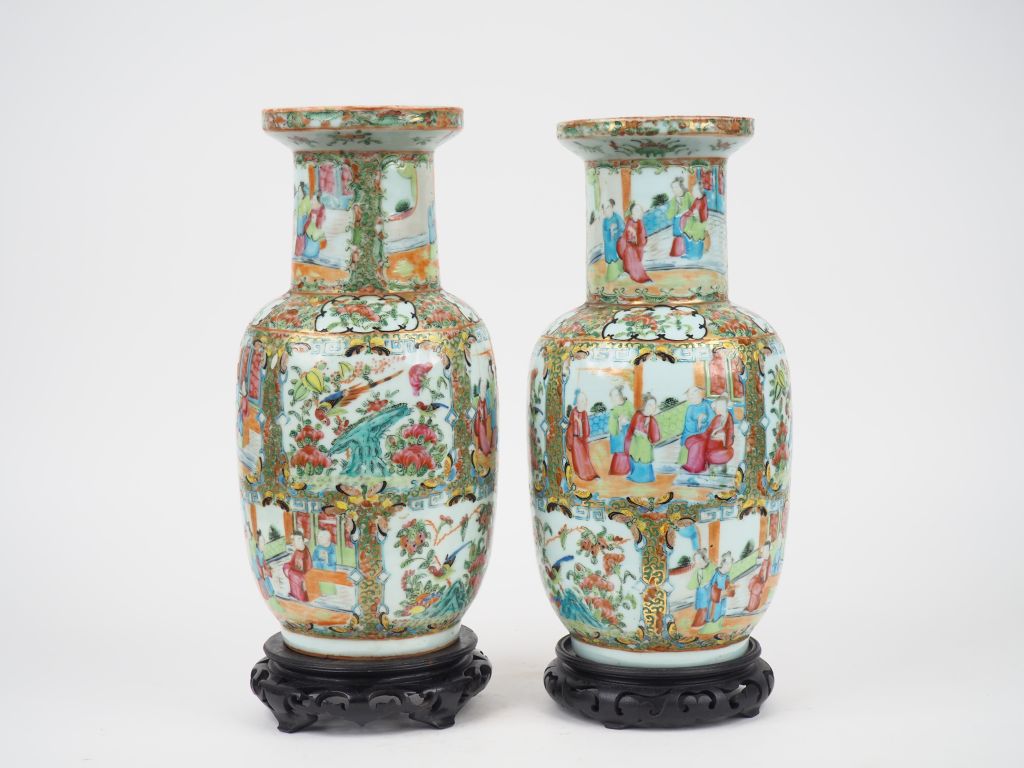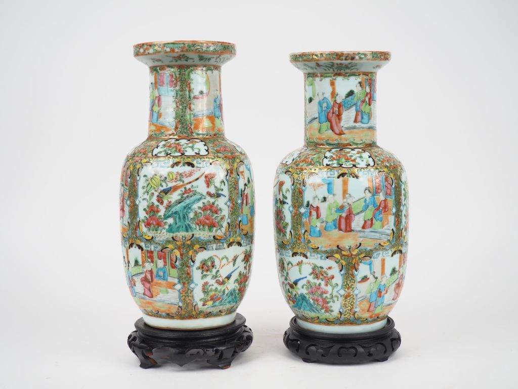 Chine vers 1880, Paire de vases rouleau en porcelaine et émaux de style famille rose, à décor en médaillons alternés de scènes de cours animées de personnages, animaux, fleurs et végétaux. H. 35,5 cm.