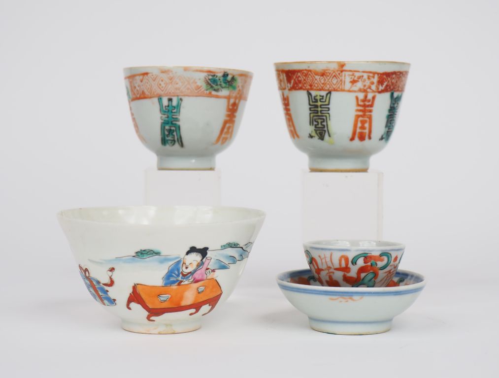 Chine, vers 1900, Deux coupes à alcool, une coupe et présentoir, un bol en porcelaine, famille rose. Diam. 4,5 à 9,5 cm.