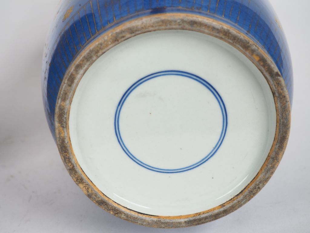 Chine vers 1900 Paire de vases de forme rouleau en porcelaine à décor de carpes en émail rouge de cuivre sur fond bleu poudré évoluant parmi des plantes aquatiques rehaussées d'or. H. 46 cm. Provenance : Maison Besaucele, rue Boulbonne Toulouse.