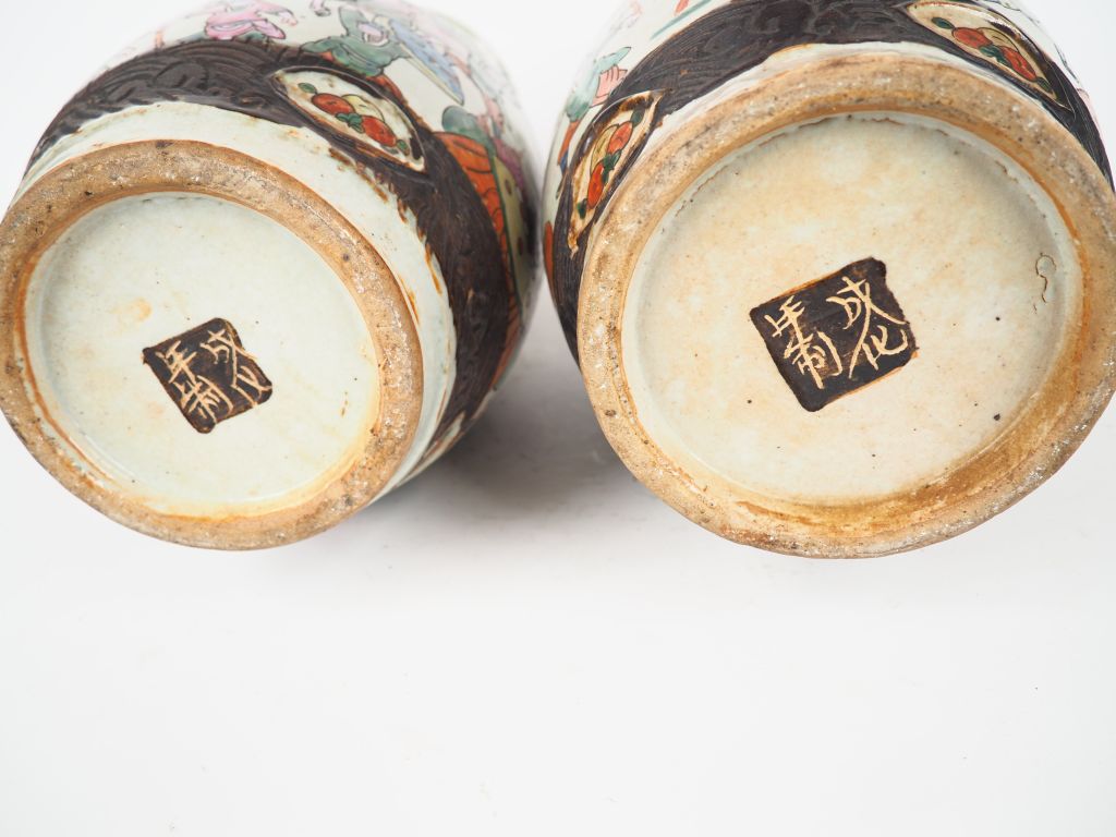 Chine, vers 1900, Paire de vases en porcelaine de nankin à décor en polycrhomie de scènes de batailles sur fond craquelé beige. H. 45 cm