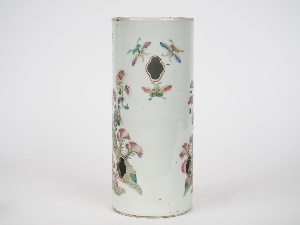 Chine, vers 1900. Porte perruques en porcelaine de la famille rose à décor de coqs. H. 29,5 cm