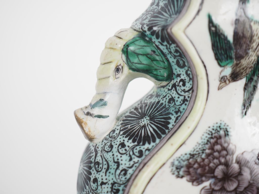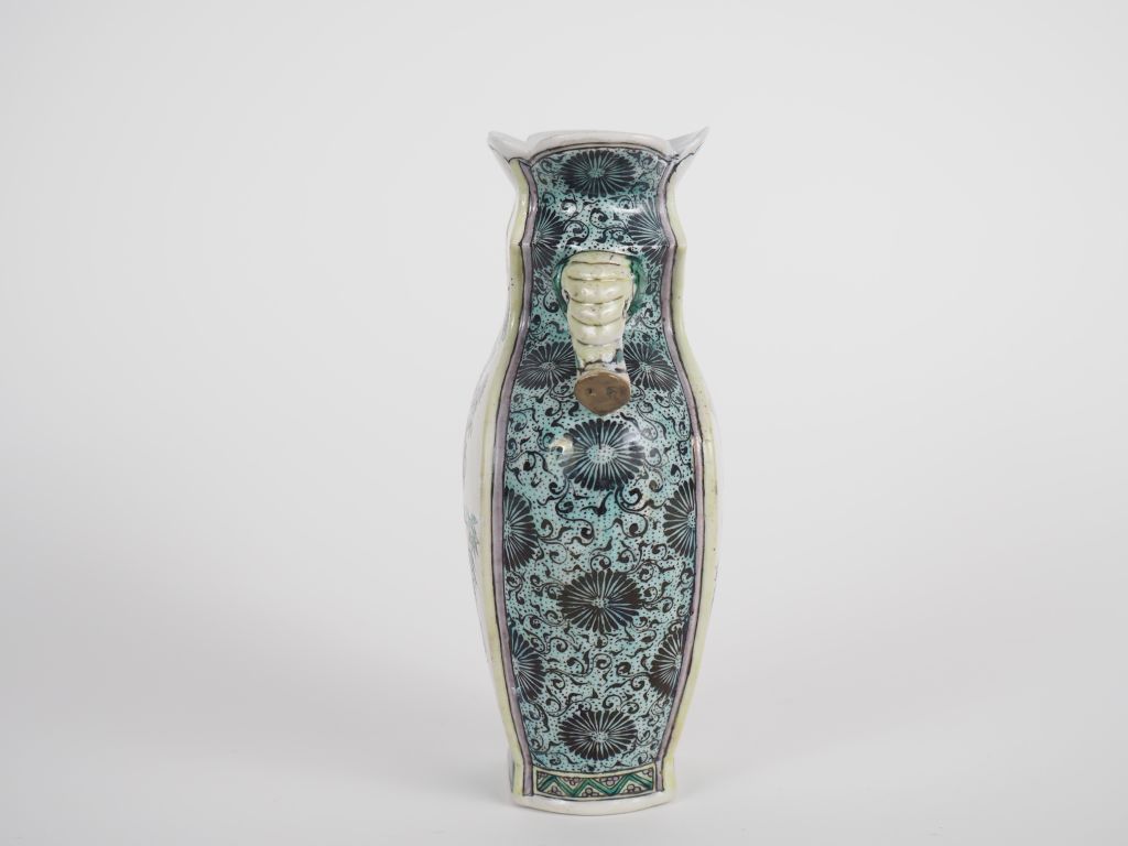 Chine, vers 1900 Vase balustre en porcelaine et émaux de style famille verte, à décor d’oiseaux, pivoines et chrysanthèmes. Le col quadrilobé est orné de têtes d’éléphant en relief. H. 19 cm (restaurations)