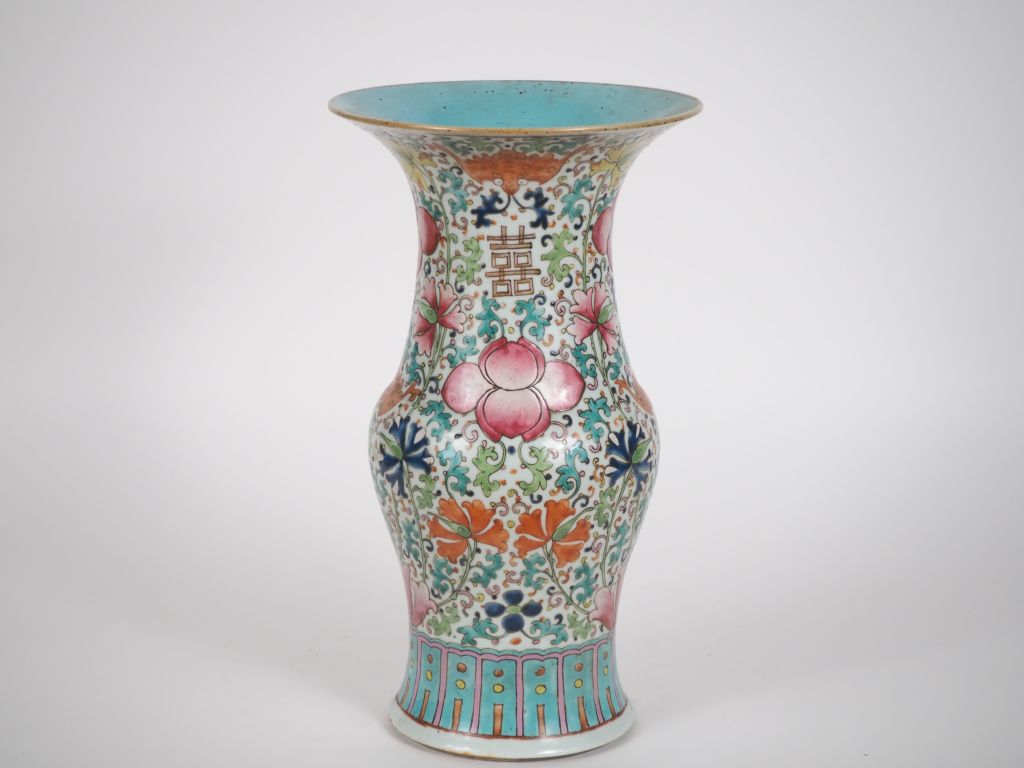 Chine, vers 1900, Vase yenyen en porcelaine et émaux polychromes, à décor de fleurs de lotus, chauves-souris, sur fond de tiges feuillagées. Des panneaux de lotus stylisés apposés en frise, complètent l’ornementation du talon. Petit éclat au talon, petit fel au col. H. 39 cm