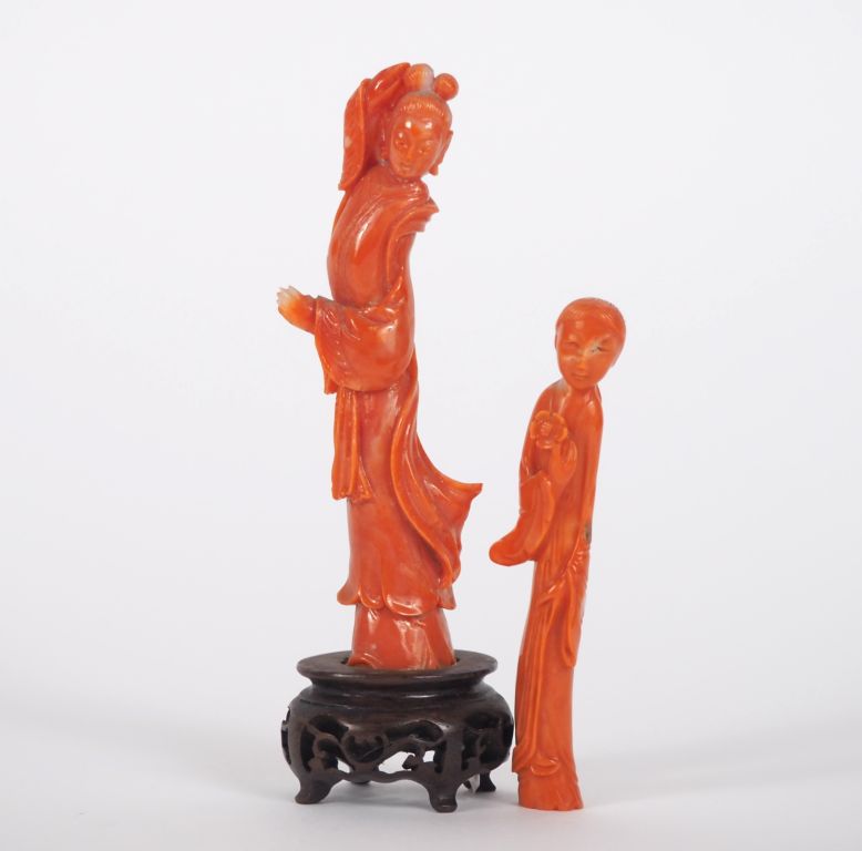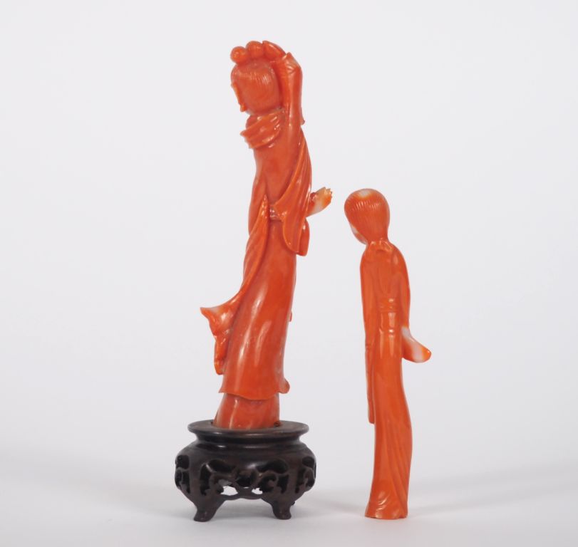 Chine, vers 1920, Deux statuettes en corail représentant des déesses du printemps. H. 7,5 cm H. 9 cm Poids. 11 gr Poids. 35 gr