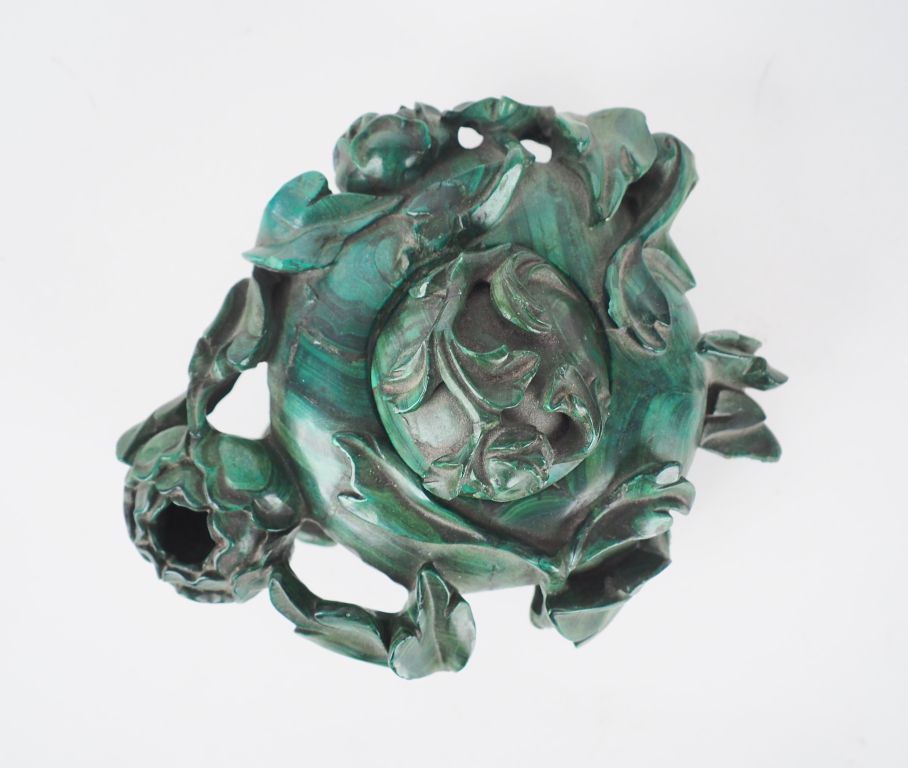 Chine, vers 1930, Coupe couverte en malachite forme de bouton de pivoine. Diam. 17,5 cm (socle rapporté)