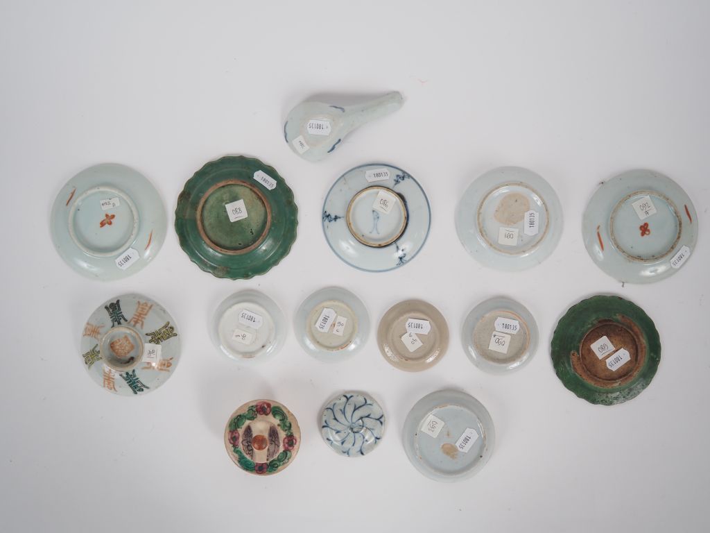 Chine, XIXe siècle, Ensemble comprenant 15 porcelaines, dont coupes creuses, assiettes, couvercles, cuillère en porcelaine bleu blanc, famille rose…à décor divers de fleurs, chauves-souris, rinceaux feuillagés, motifs shou… Usures. Dim. diverses.
