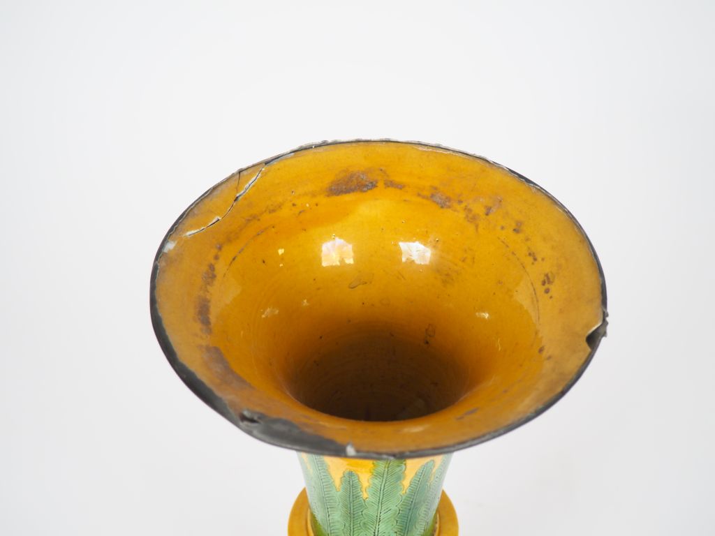 Chine XIXe siècle, Ensemble comprenant un vase gu et vase globulaire en porcelaine émaillée jaune à décor polychrome de lions bouddhiques parmi nuages stylisés, l’autre à décor de feuilles de bananiers et frise de grecque sur le pourtour. Accidents au col du vase gu, monture en bronze. H. 31,5 cm et H.16 cm