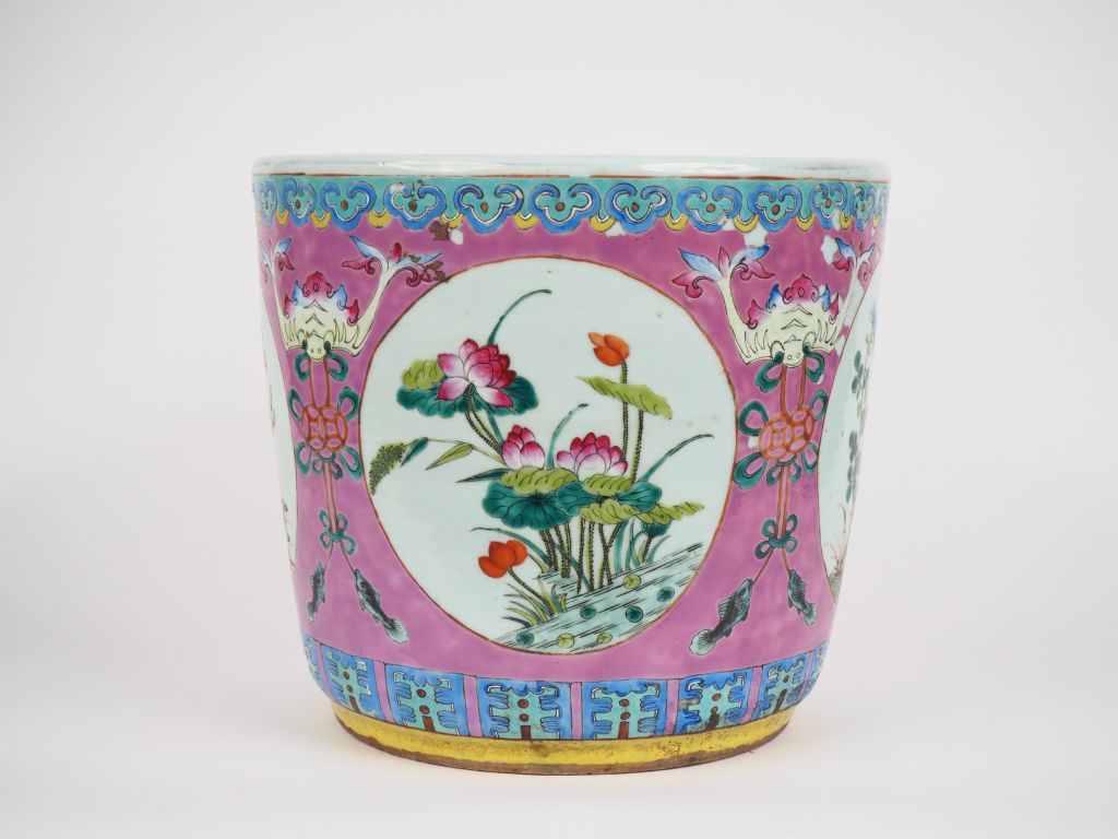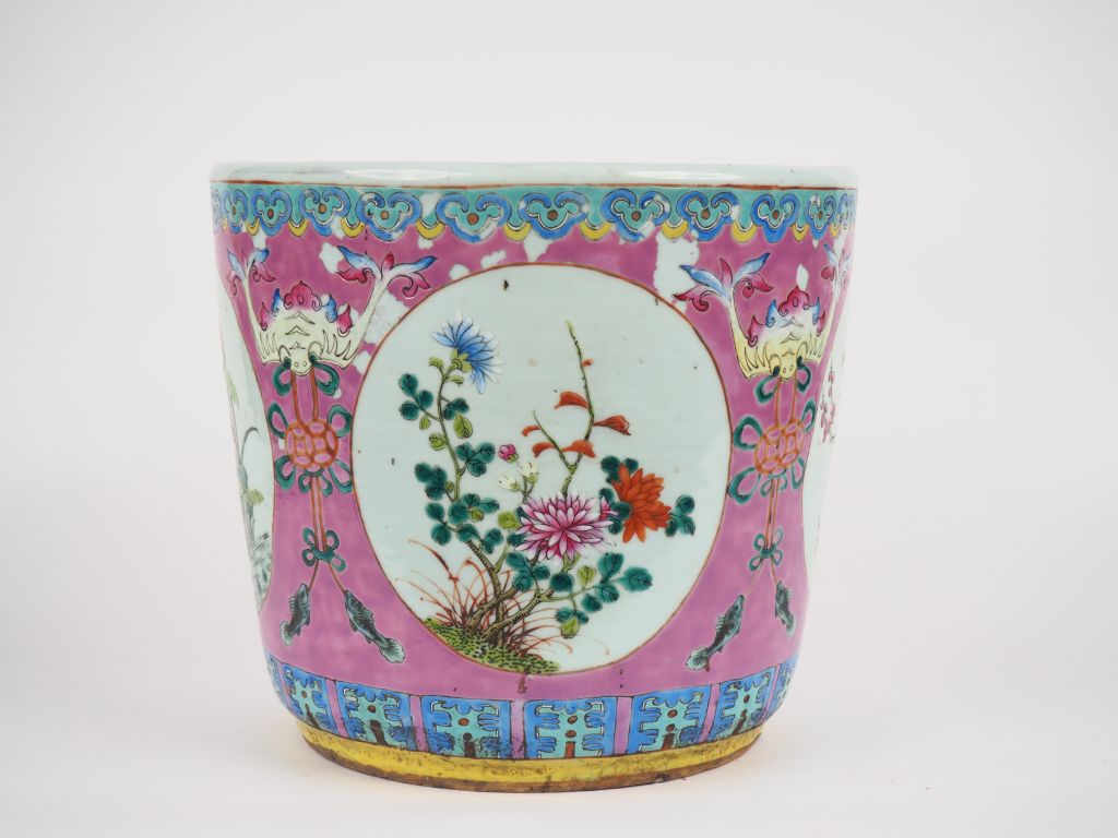 Chine, XIXe siècle, Jardinière en porcelaine et émaux polychromes, à décor en médaillons de fleurs reposant sur un fond rose à décor de lambrequins. Une frise de têtes de ruyi orne le pourtour du col. Fond percé et sauts d’émail. Dim. 32,5 x 35,5 cm