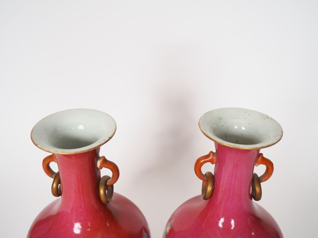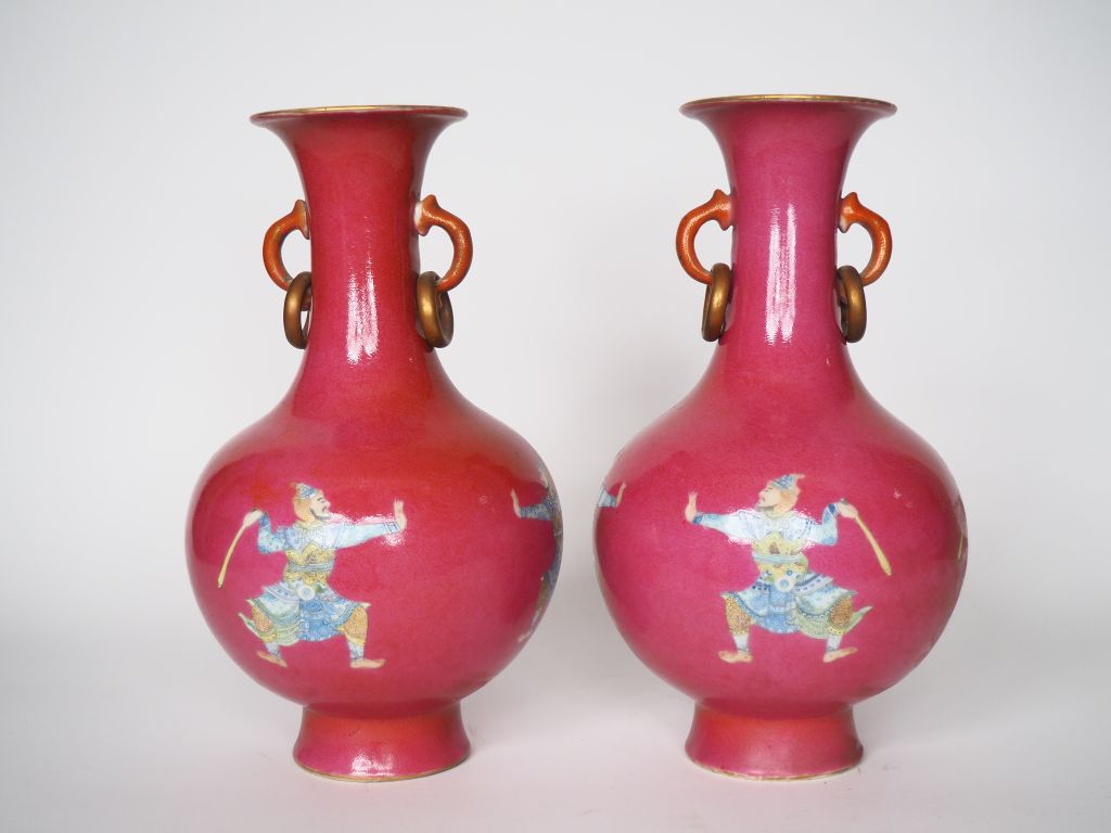 Chine, XIXe siècle, Paire de vases de forme balustre en porcelaine, à décor en émaux de la famille rose sur fond sgraffito fuchsia de guerriers étrangers. Le col orné de dragons stylisés émaillés en corail et réhauts d'or auxquels deux anneaux sont suspendus. H.33 cm L'un avec un éclat au col, l'autre avec un grand fel.