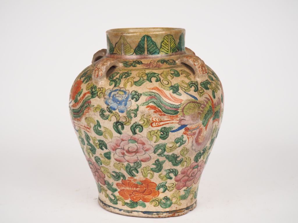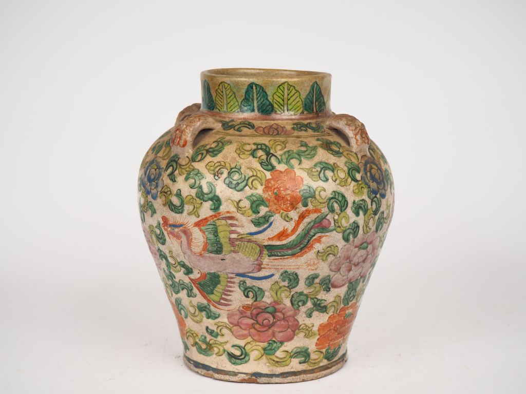 Chine, XIXe siècle, Petite jarre en céramique et émaux de style famille verte, à décor de phoénix parmi fleurs et rinceaux feuillagés. Quatre têtes de dragons complètent l'ornementation. H. 31 cm