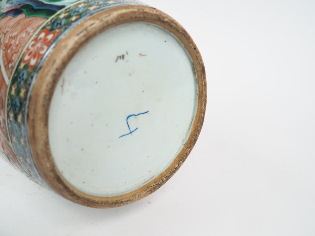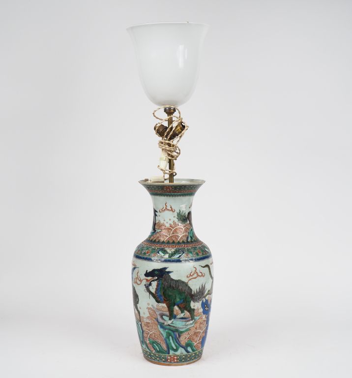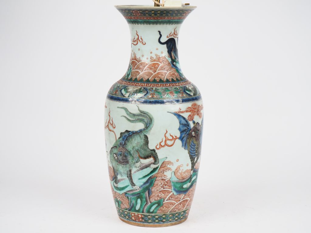 Chine, XIXe siècle, Vase balustre en porcelaine et émaux de la famille verte, à décor d'animaux fantastiques évoluant au milieu de flots écumants. H. 46 cm Anciennement monté en lampe, éclat au col.
