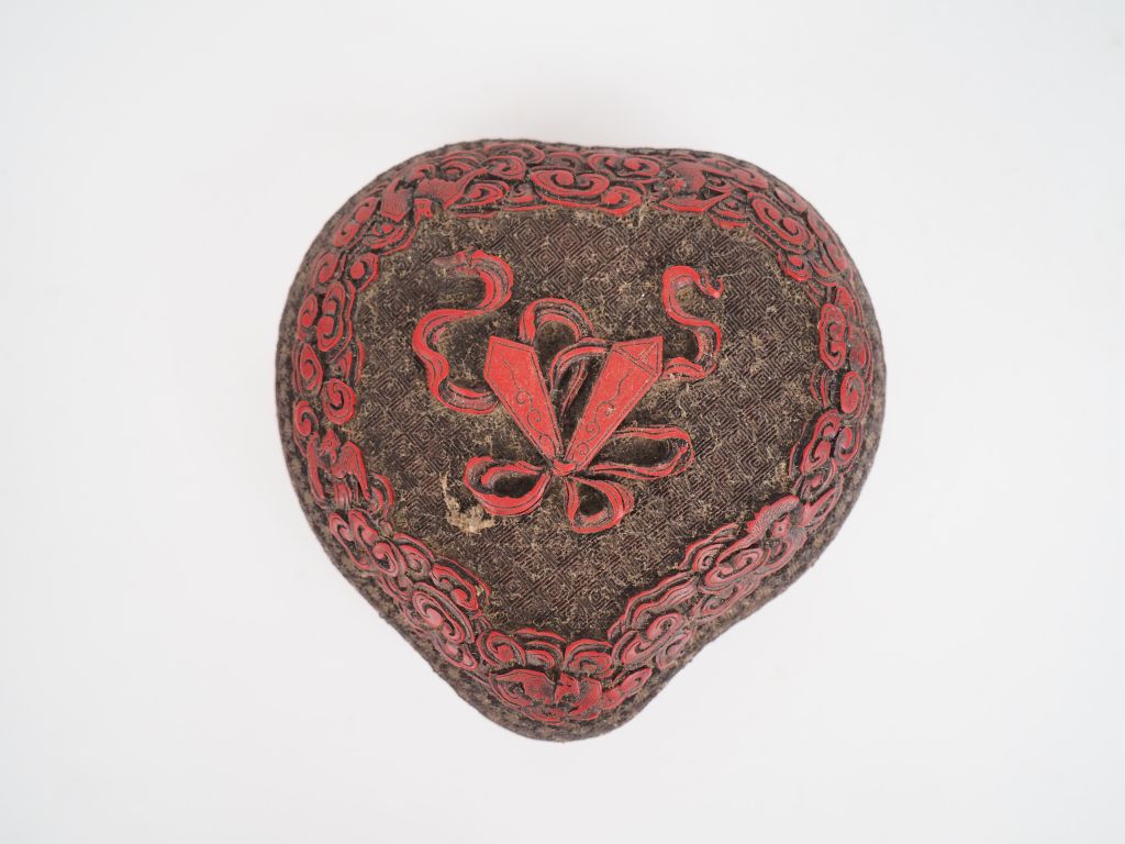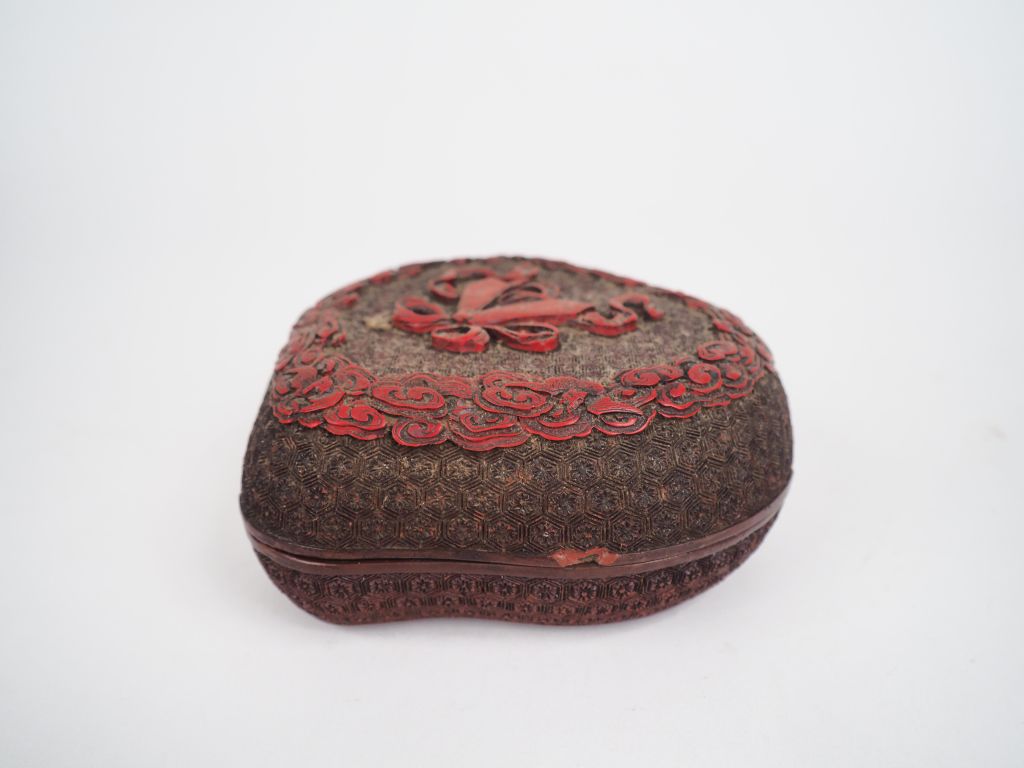 Chine XIXème siècle, Boîte couverte en laque de Cinabre reprenant la forme d'une pêche de longévité, à décor finement sculpté de Wu-fu évoluant dans des nuages stylisés, reponsant sur un fond nid d'abeille et frise de grecques. Orné en son centre d'un nœud de ruban. Dim. 11,2 x 11,5 cm. (Petit éclat et manques).